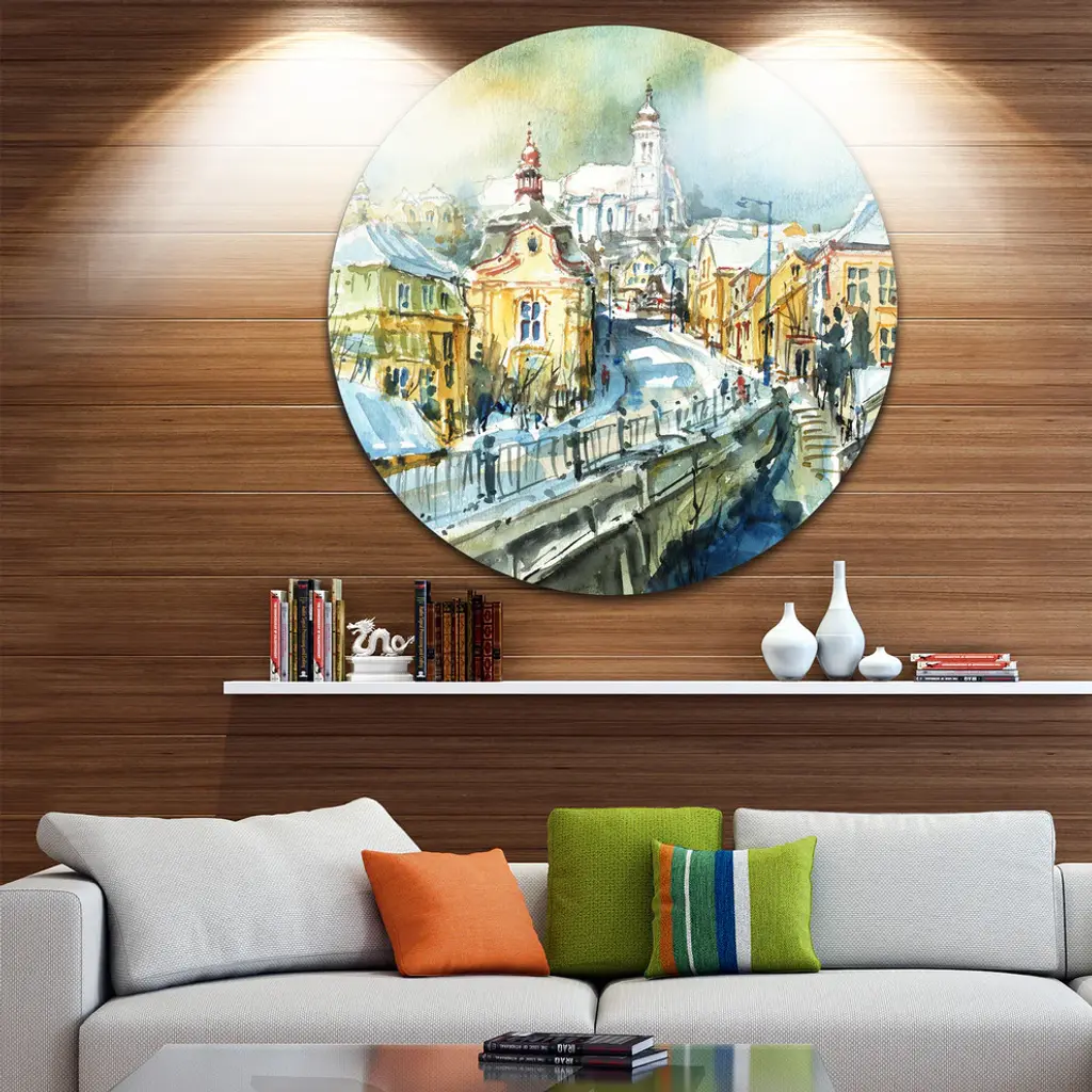 Bring Contemporary Abstraction to your home with this large Circle Metal wall art. This City of Churches Watercolor Metal Artwork makes it the focal point of any room or office. - White Gloss Coating ensures colors are extra vibrant with light reflection.- Aluminum grade Sheet Metal with 1 inch mounting frame on the back giving the illusion that the artwork is floating on the wall..- Mounting Brackets are included along with instructions.- High Quality Digital images are created directly into a glossy aluminum panel producing a stunning and captivating print into the glossy finish of the metal.- Water, Fire and Scratch resistant HD Aluminum panels.- Looks better than any photo paper and guaranteed to last at least 20 years- Easy to clean with a microfiber cloth. Colors are far superior to regular Canvas Art. - Easy to Hang