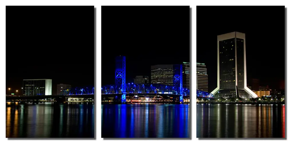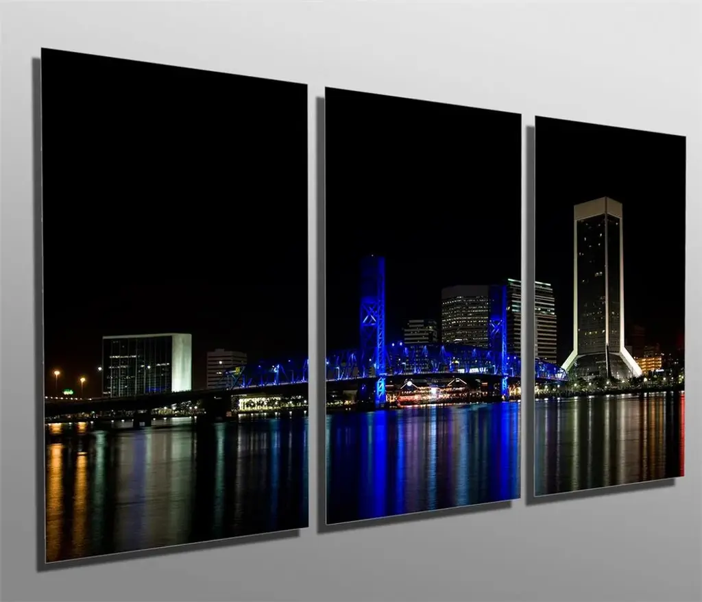 48"œ x 24"œ total size. Ready To Hang! (3 pieces - 16"œ x 24"œ each). 3 Panel Split (Triptych) Metal Print of City of light in Jacksonville, Florida at night. Modern metal wall art for home or office wall decor & interior design. Printed on Luxurious, HD aluminum glossy metal panels. Multi panel art.. HD aluminum panels. Metal print wall art. Includes Shadow Wall Mount on the back.• Aluminum Metal Wall Art• Made in USA• Ready to hang - No assembly required• Shadow mount hardware on the back• 0.045"œ thick HD Aluminum Panels• Scratch resistant, glossy finish• Superb color clarity, luxurious prints• Epson printing process• For indoor or moisture rich environment use• Easy to clean. Gently wipe with microfiber cloth.