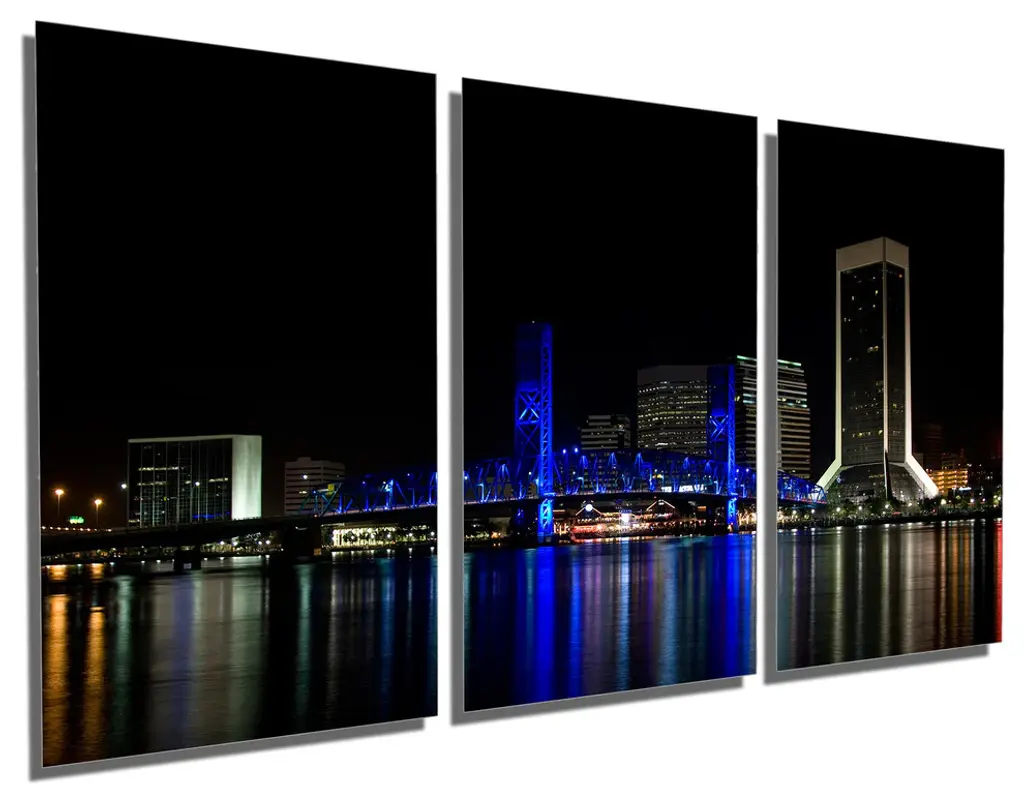 72"œ x 36"œ total size. Ready To Hang! (3 pieces - 24"œ x 36"œ each). 3 Panel Split (Triptych) Metal Print of City of light in Jacksonville, Florida at night. Modern metal wall art for home or office wall decor & interior design. Printed on Luxurious, HD aluminum glossy metal panels. Multi panel art.. HD aluminum panels. Metal print wall art. Includes Shadow Wall Mount on the back.• Aluminum Metal Wall Art• Made in USA• Ready to hang - No assembly required• Shadow mount hardware on the back• 0.045"œ thick HD Aluminum Panels• Scratch resistant, glossy finish• Superb color clarity, luxurious prints• Epson printing process• For indoor or moisture rich environment use• Easy to clean. Gently wipe with microfiber cloth.