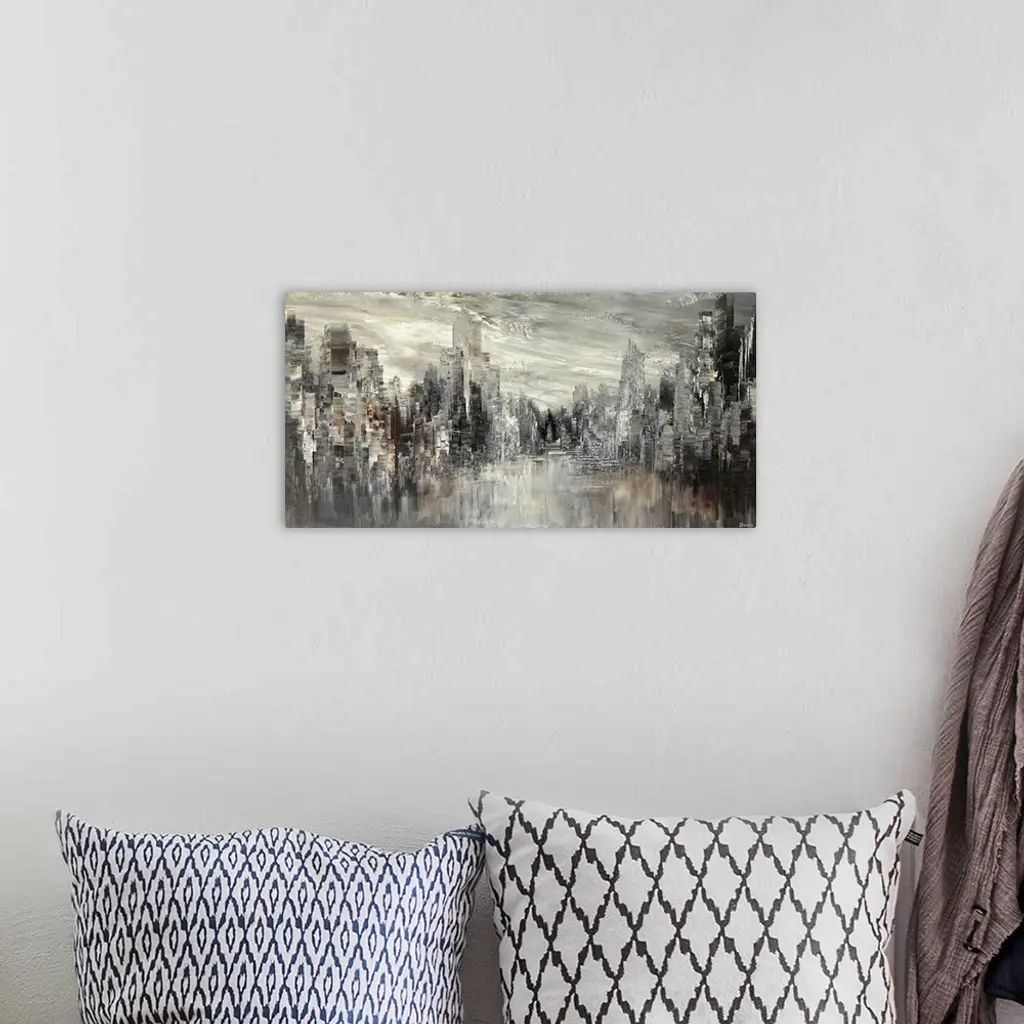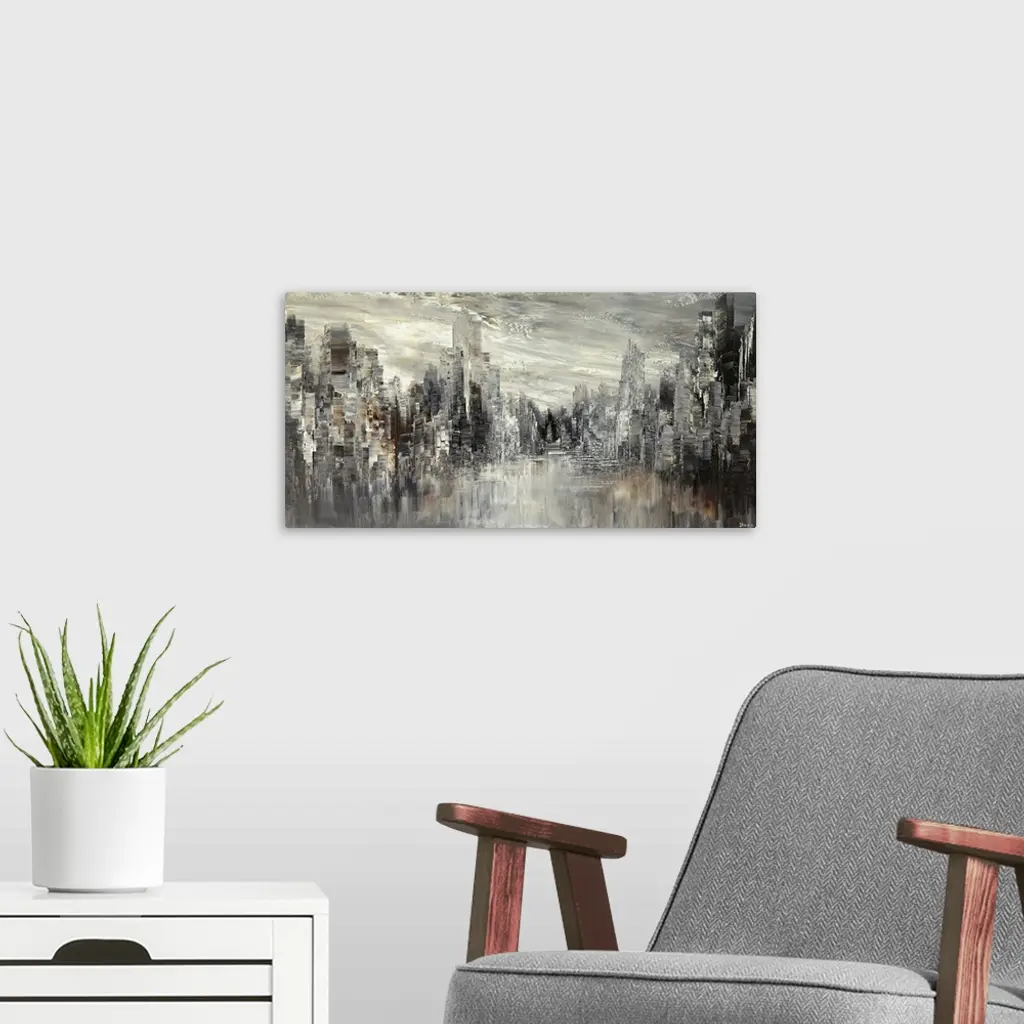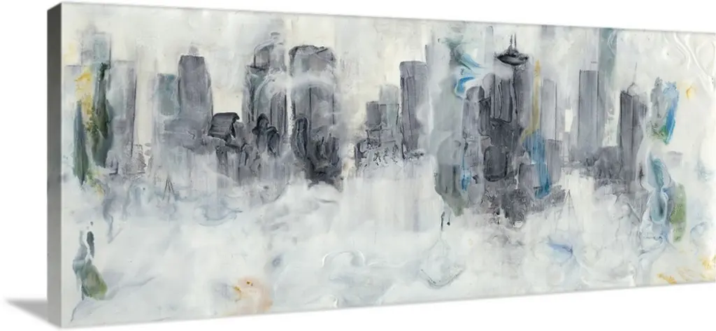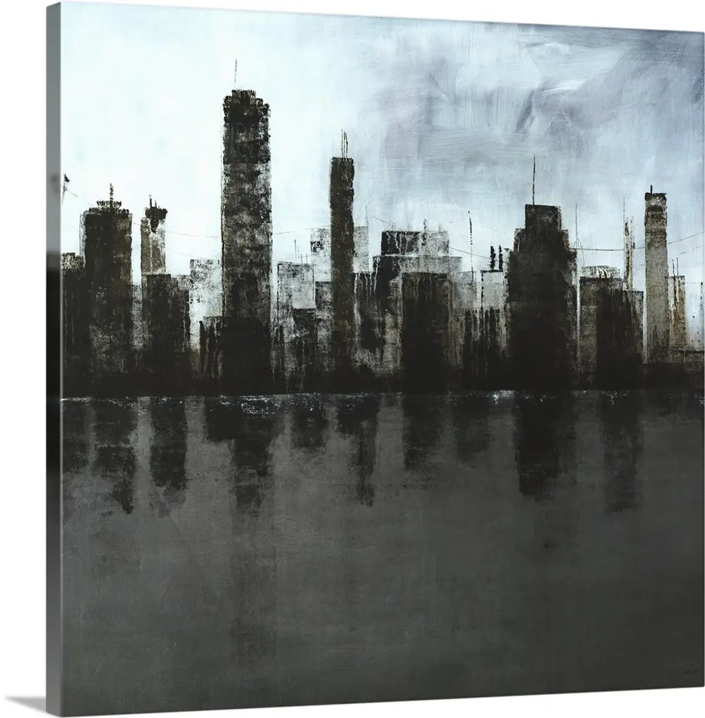 Contemporary painting of a large city full of skyscrapers with a gloomy sky.