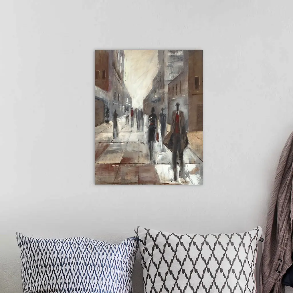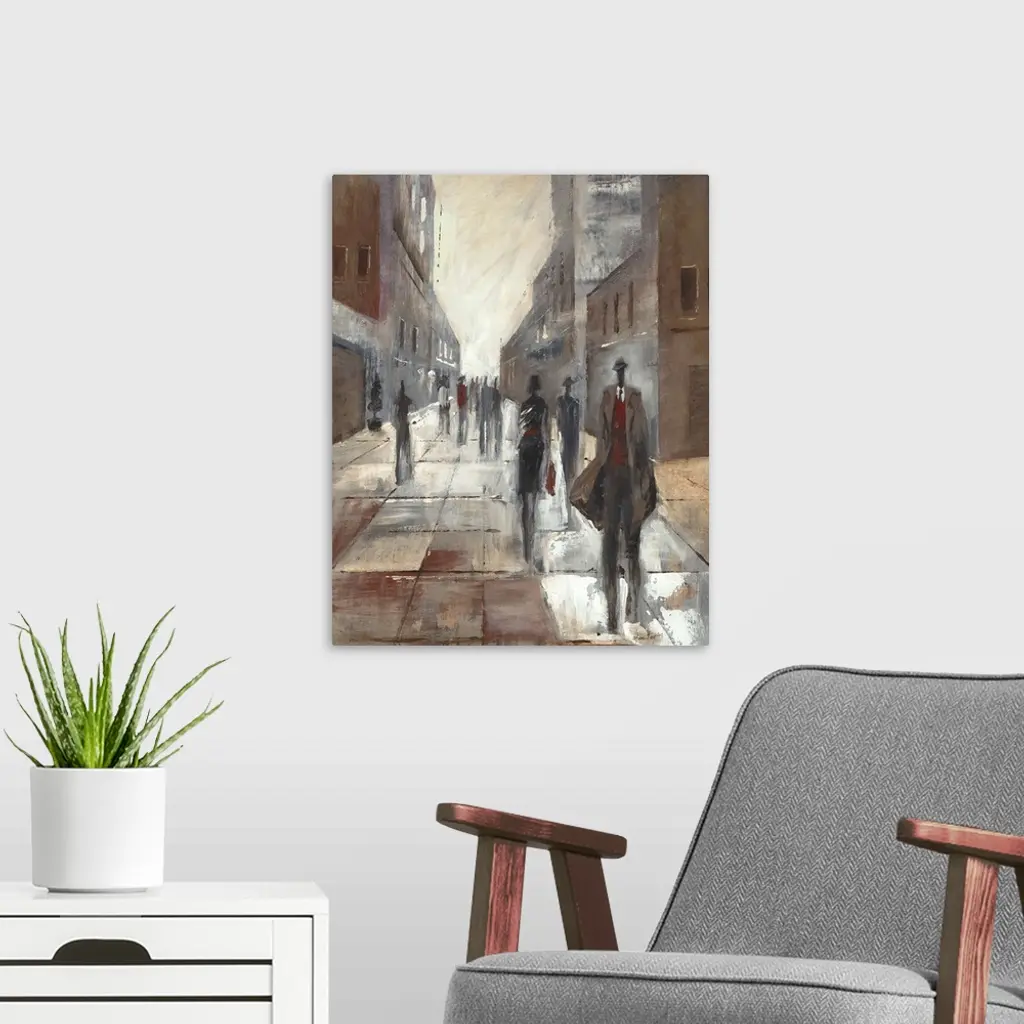 Contemporary painting of elongated figures walking along a city street.