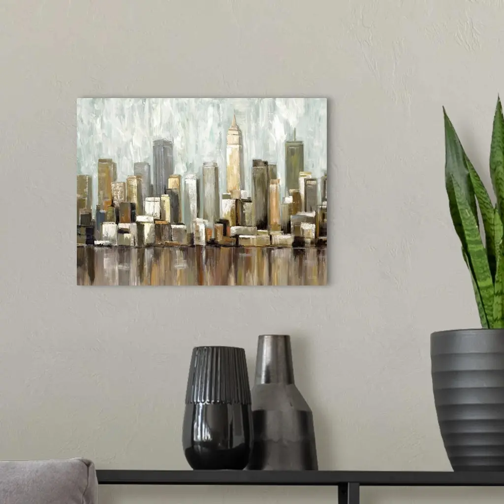 Contemporary artwork of a city skyline casting a reflection in the river below.