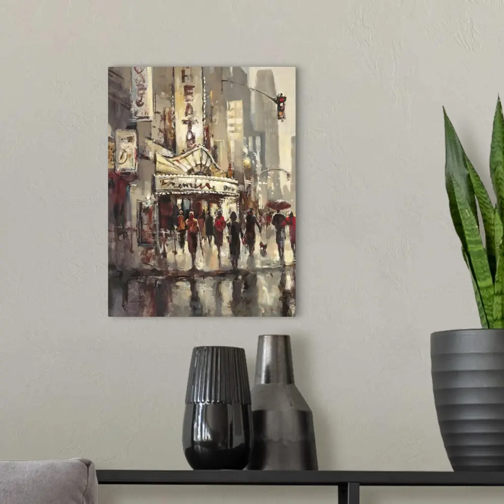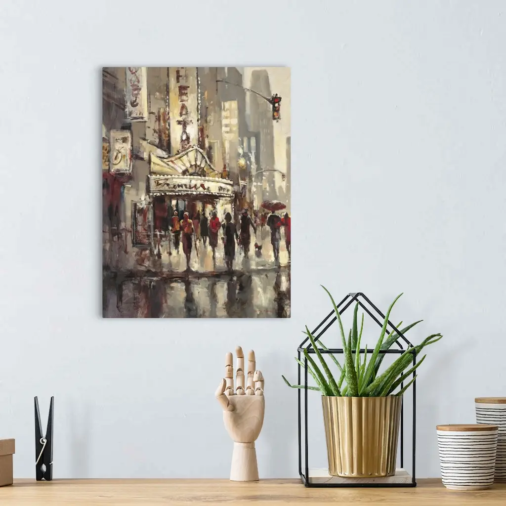Painting of city streets with people casting reflections on a wet road, with a theater in the background.