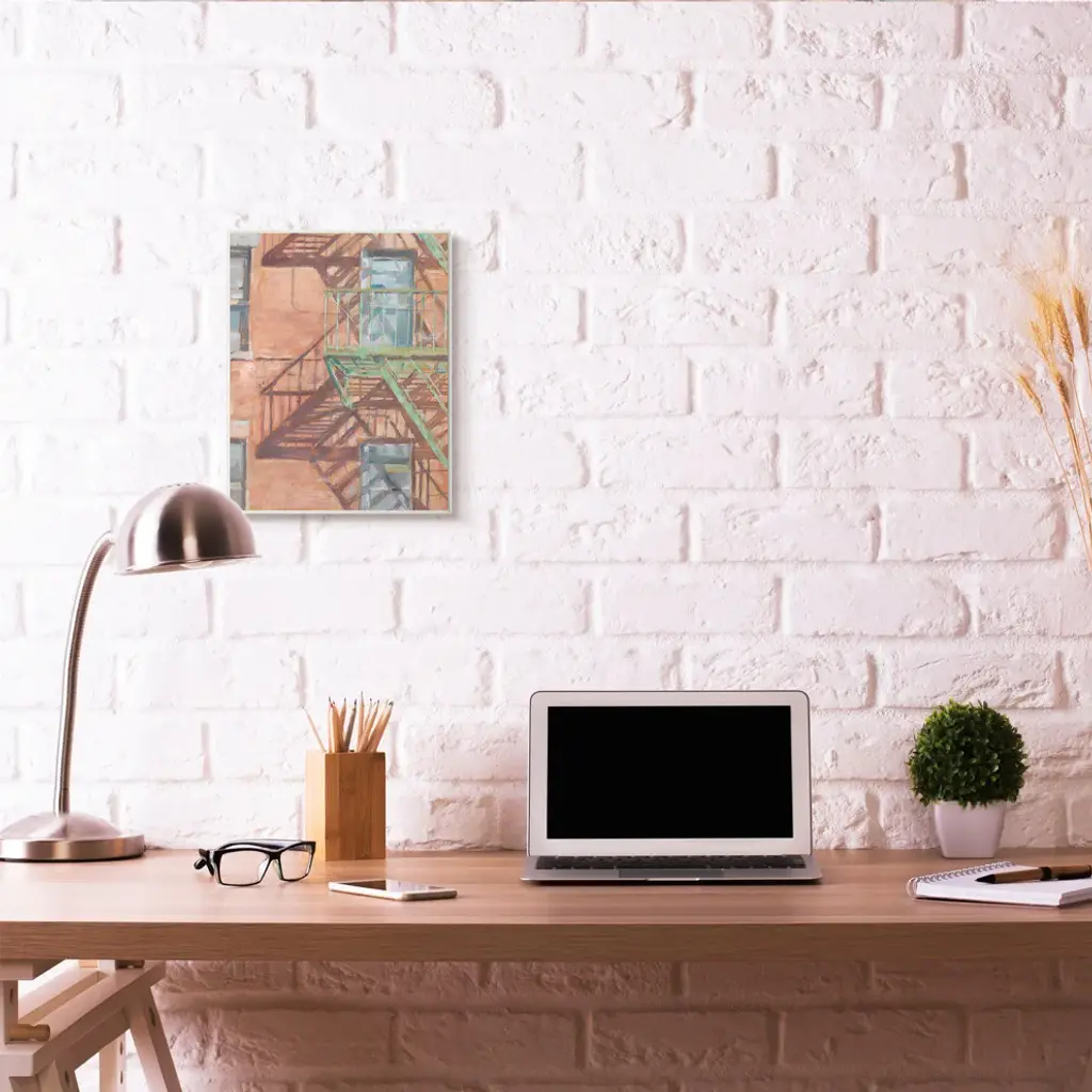 Cityscape Fire Escape Red Green Painting, 13"x19"