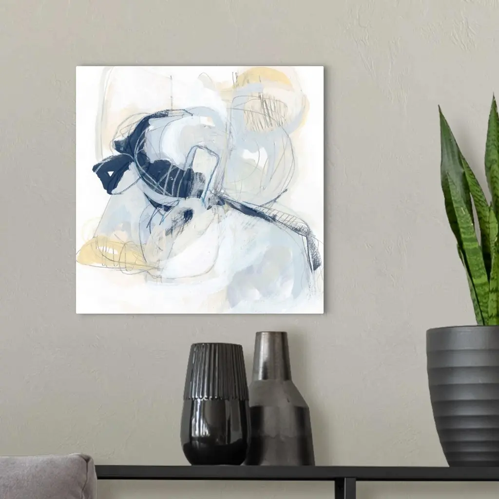 Square abstract painting in yellow, gray and white in overlapping circular shapes with fine scribble lines of gray and blue.