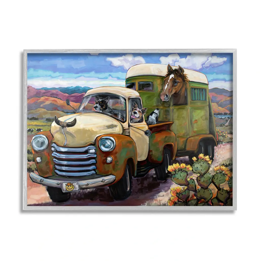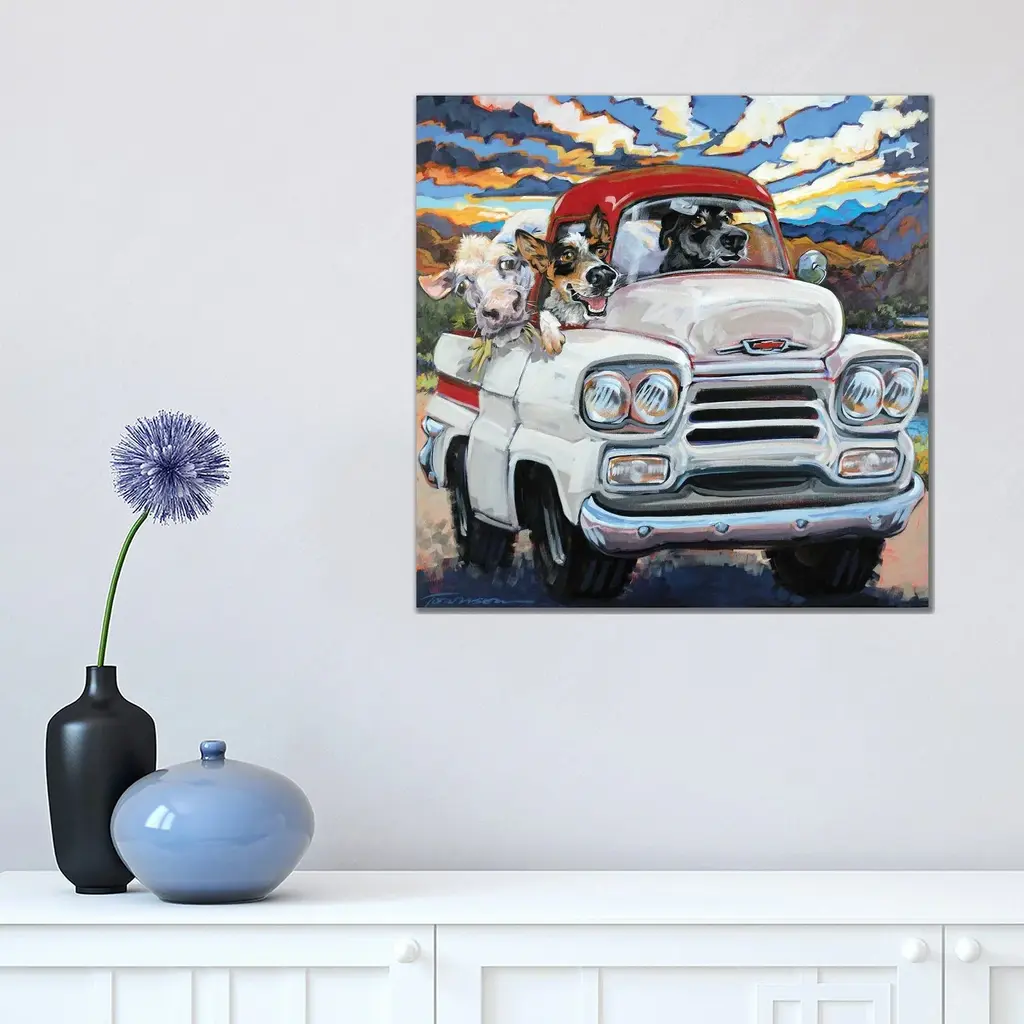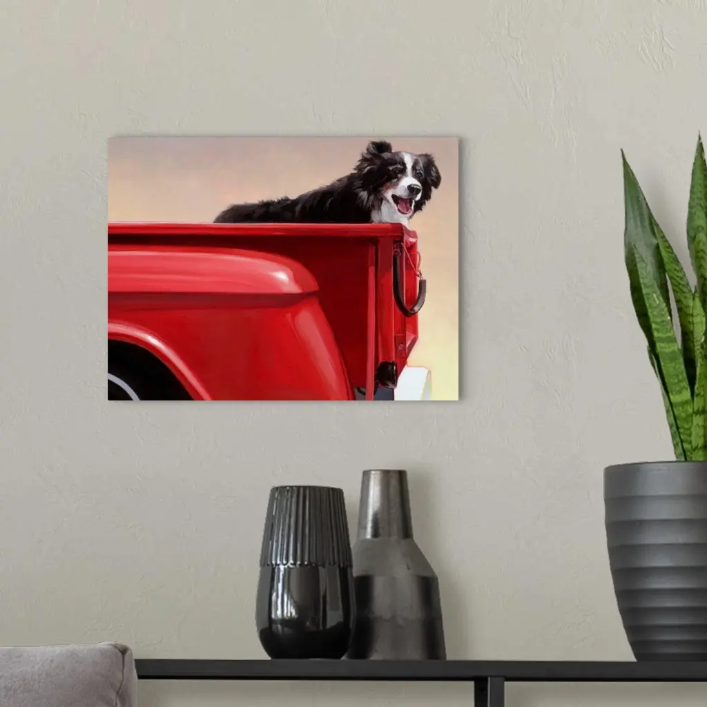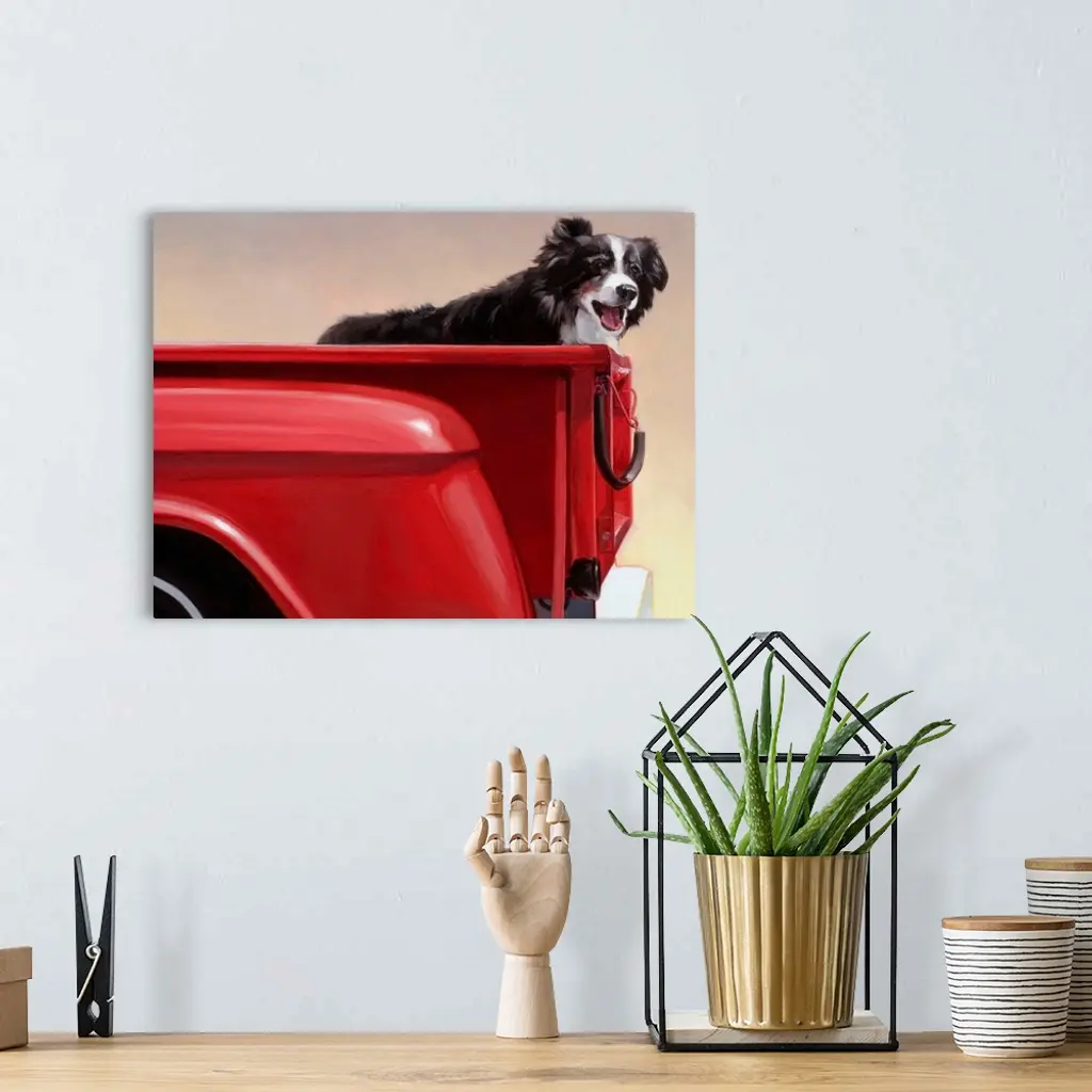 Painting on canvas of a dog standing in the back of an old truck bed.