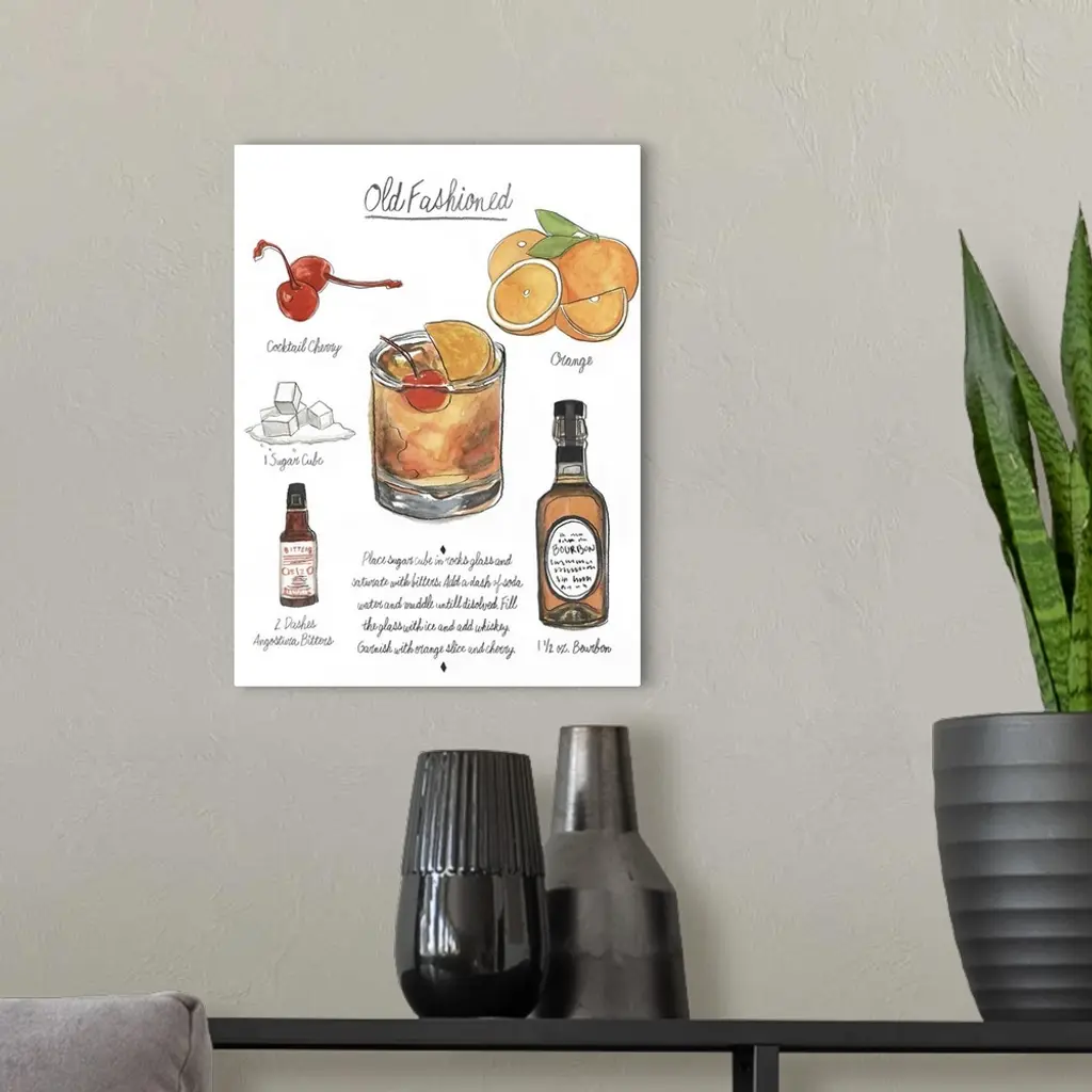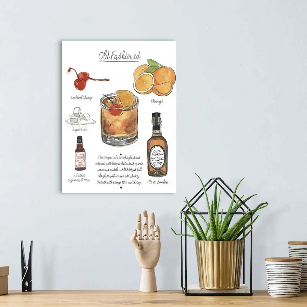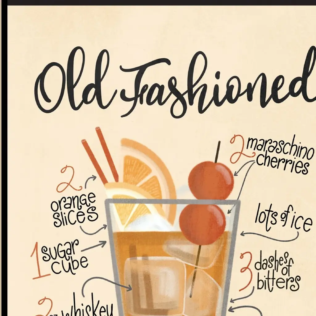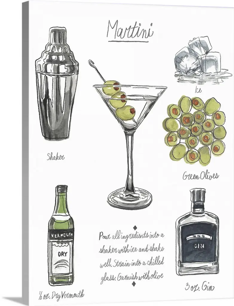 Contemporary artwork of a cocktail recipe showing illustrated ingredients against a white background.