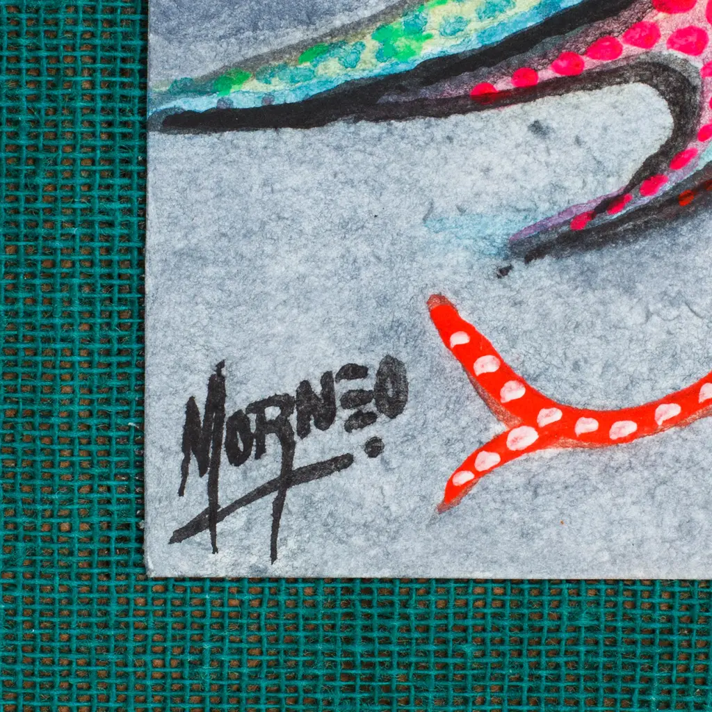 Born in 1930s Mexico, Pedro Linares' alebrijes initiated a trend of imagination, color, fantasy and tradition that masterfully merges in their fantastic appearance. As a series of imaginary creatures with captivating characteristics, the alebrijes create an ethereal vibe in any interior, inspiring magnificent artworks like Morneo's newest watercolor painting. Continuing Pedro Linares' legacy, this expressionist composition portrays a fish with a large tongue in the Alebrije style, combining intense hues for a vivacious vibe.The piece, titled Alebrije Pez Lengua in Spanish, comes signed, stretched and on a mat.