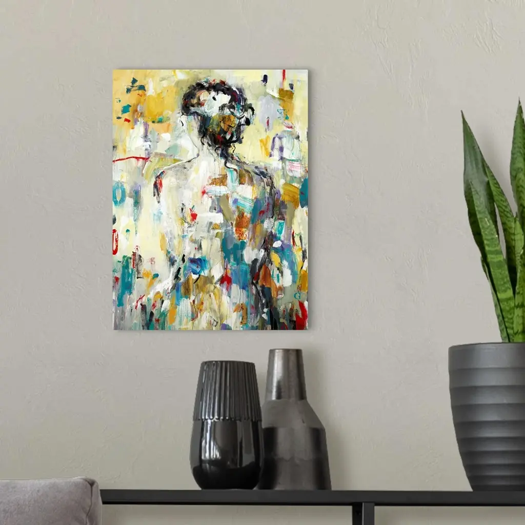 Contemporary abstract painting of the back of a woman made up of various hues layered together with small, busy brushstrokes.