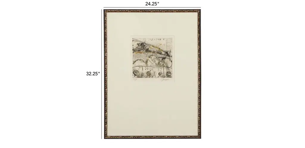 Rhythmic arches are the focus of these compositions, loose renderings of vaulted bridges by artist Joe Joseph. Hand-applied embellishments add subtle sophistication to this pair of giclées on paper. An oversize 6-ply ecru mat draws the eye inward while a coordinating frame—soft gold brushed atop a textured black surface—echoes each work’s palette.