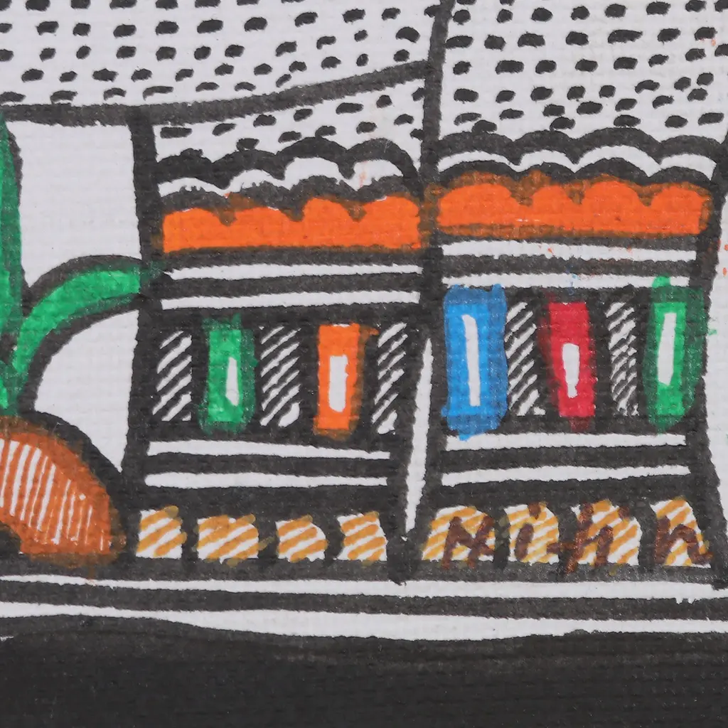 The sun gives life and joy to any creature in this harmonious world. Made as an homage to this sacred star, Nitin Kumar Jha's Madhubani painting merges bold natural dyes into the intricate but majestic pattern that composes this sublime artwork. The piece also portrays a royal elephant as a message of luck and wisdom.The artwork arrives signed and unstretched.