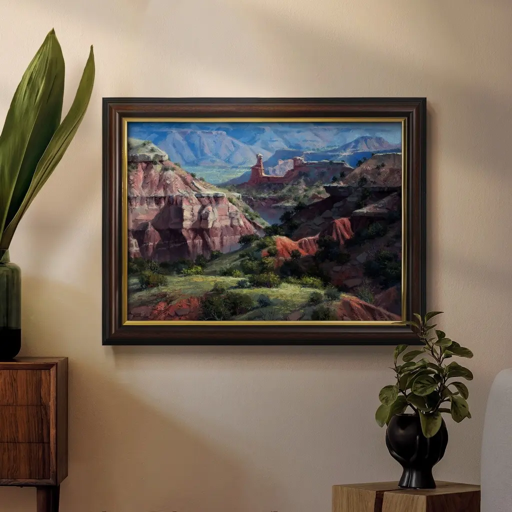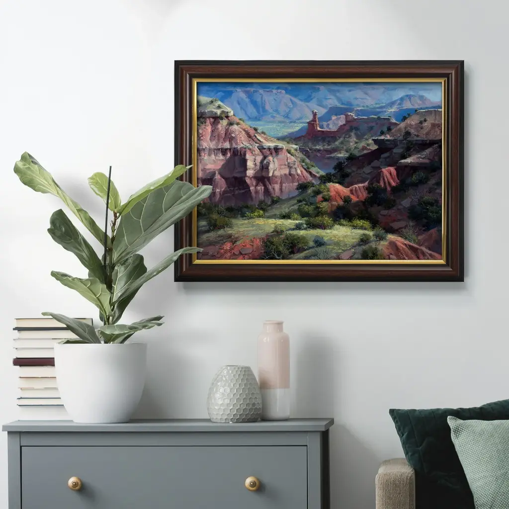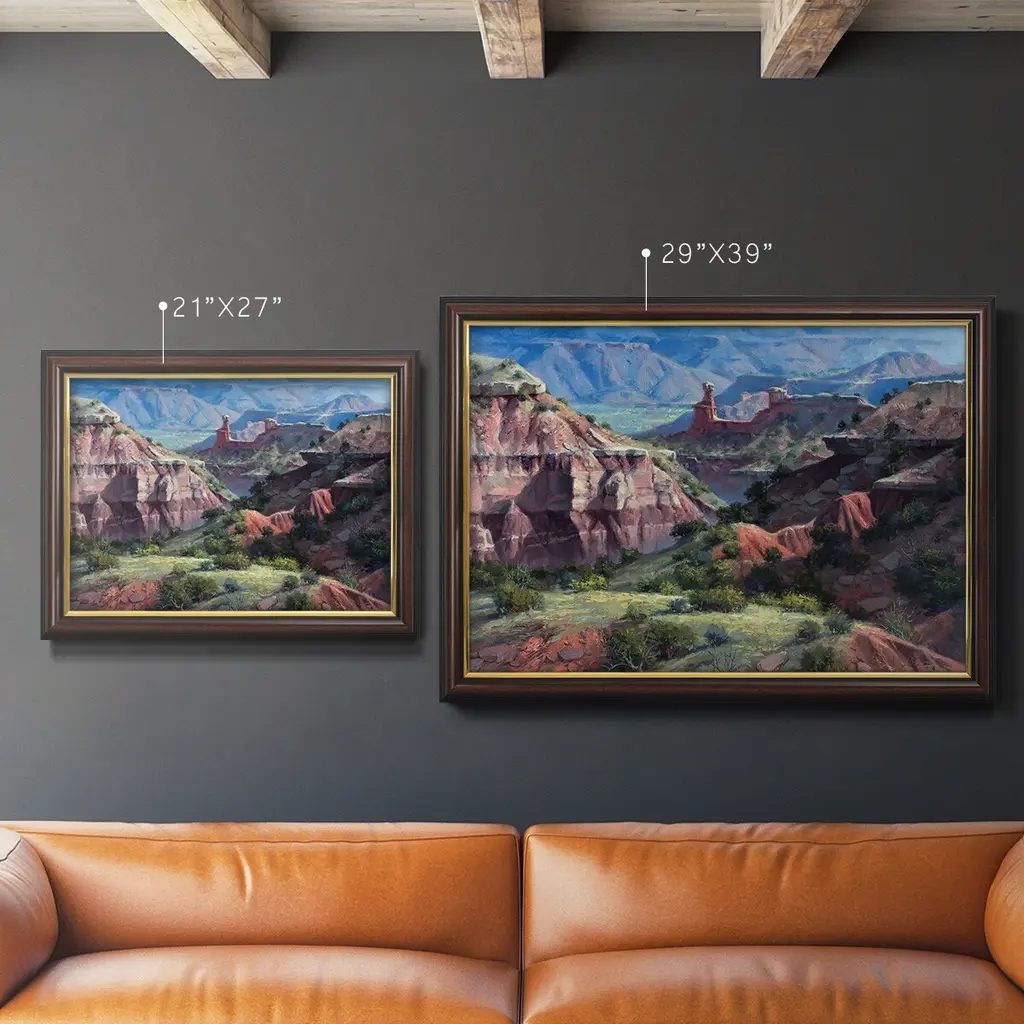 Classic Palo Duro Premium Framed Canvas- Ready to Hang A Premium Framed Canvas created to last. Framed in distressed wood and available in an array of sizes and colors Featuring a beveled a solid wood stretcher bar, each piece comes ready to hand 3 SIZES AVAILABLE 16''X20'' - Overall Size 18'X27'' - Overall Size 24''x36'' - Overall Size Each piece is made to order. Each piece comes with hanging hardware. Made in the USA Ready to Hang Giclee Paper Print Acrylic Glass Beveled Matt Board