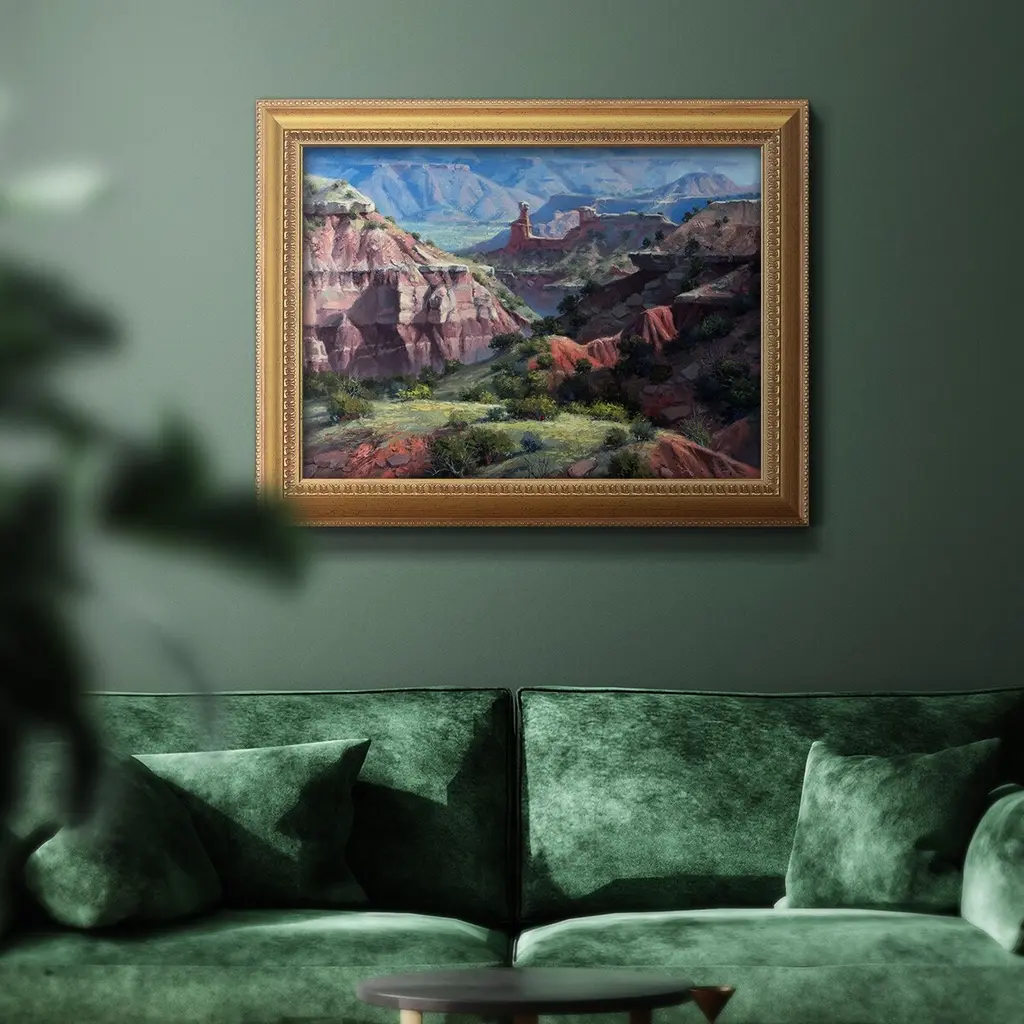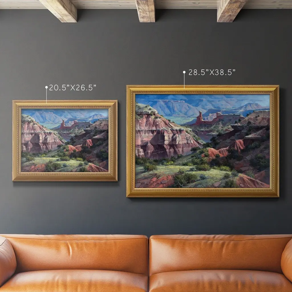 Classic Palo Duro Premium Framed Canvas- Ready to Hang A Premium Framed Canvas created to last. Framed in distressed wood and available in an array of sizes and colors Featuring a beveled a solid wood stretcher bar, each piece comes ready to hand 3 SIZES AVAILABLE 16''X20'' - Overall Size 18'X27'' - Overall Size 24''x36'' - Overall Size Each piece is made to order. Each piece comes with hanging hardware. Made in the USA Ready to Hang Giclee Paper Print Acrylic Glass Beveled Matt Board