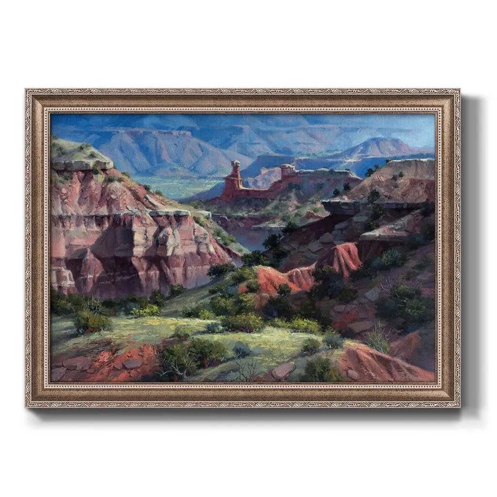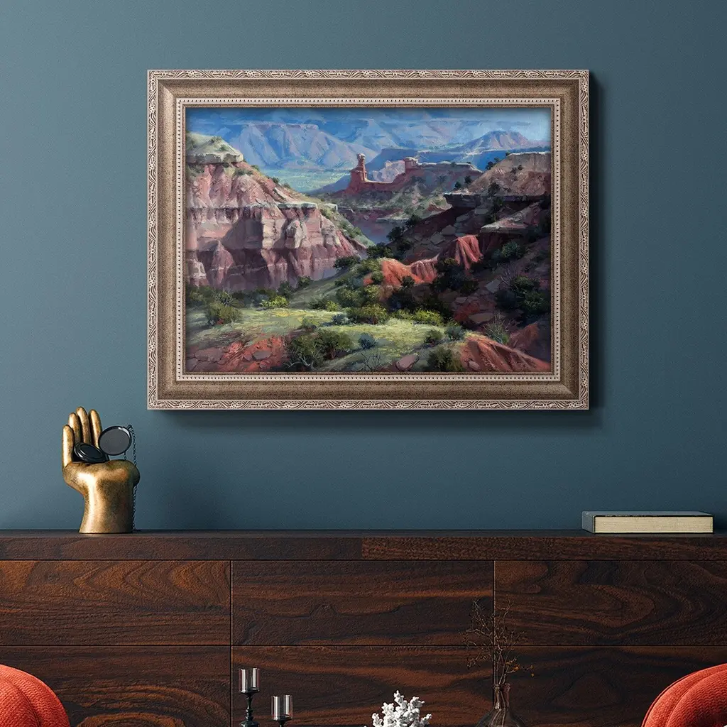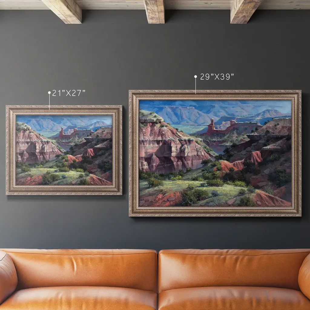 Classic Palo Duro Premium Framed Canvas- Ready to Hang A Premium Framed Canvas created to last. Framed in distressed wood and available in an array of sizes and colors Featuring a beveled a solid wood stretcher bar, each piece comes ready to hand 3 SIZES AVAILABLE 16''X20'' - Overall Size 18'X27'' - Overall Size 24''x36'' - Overall Size Each piece is made to order. Each piece comes with hanging hardware. Made in the USA Ready to Hang Giclee Paper Print Acrylic Glass Beveled Matt Board