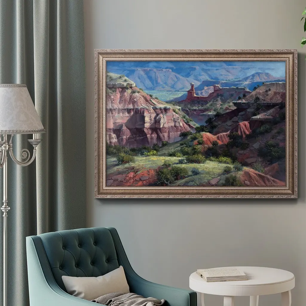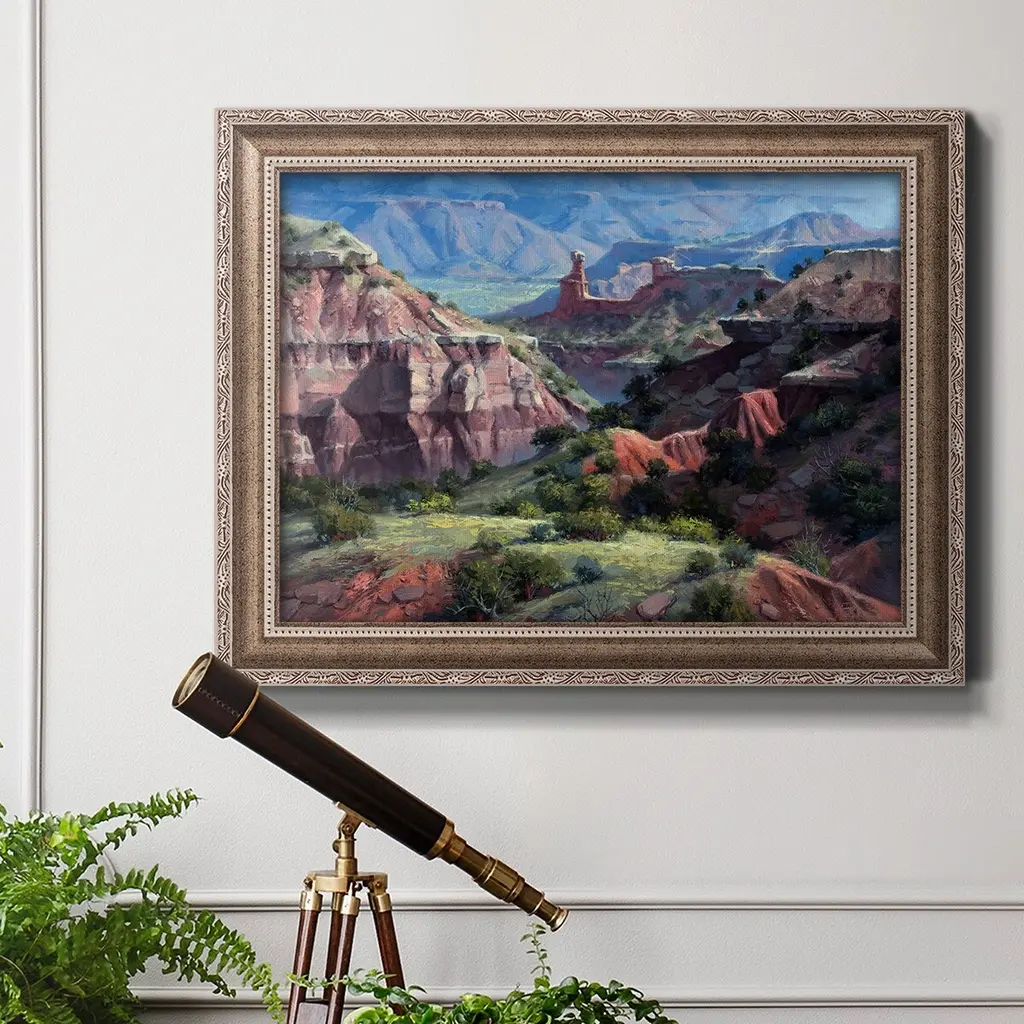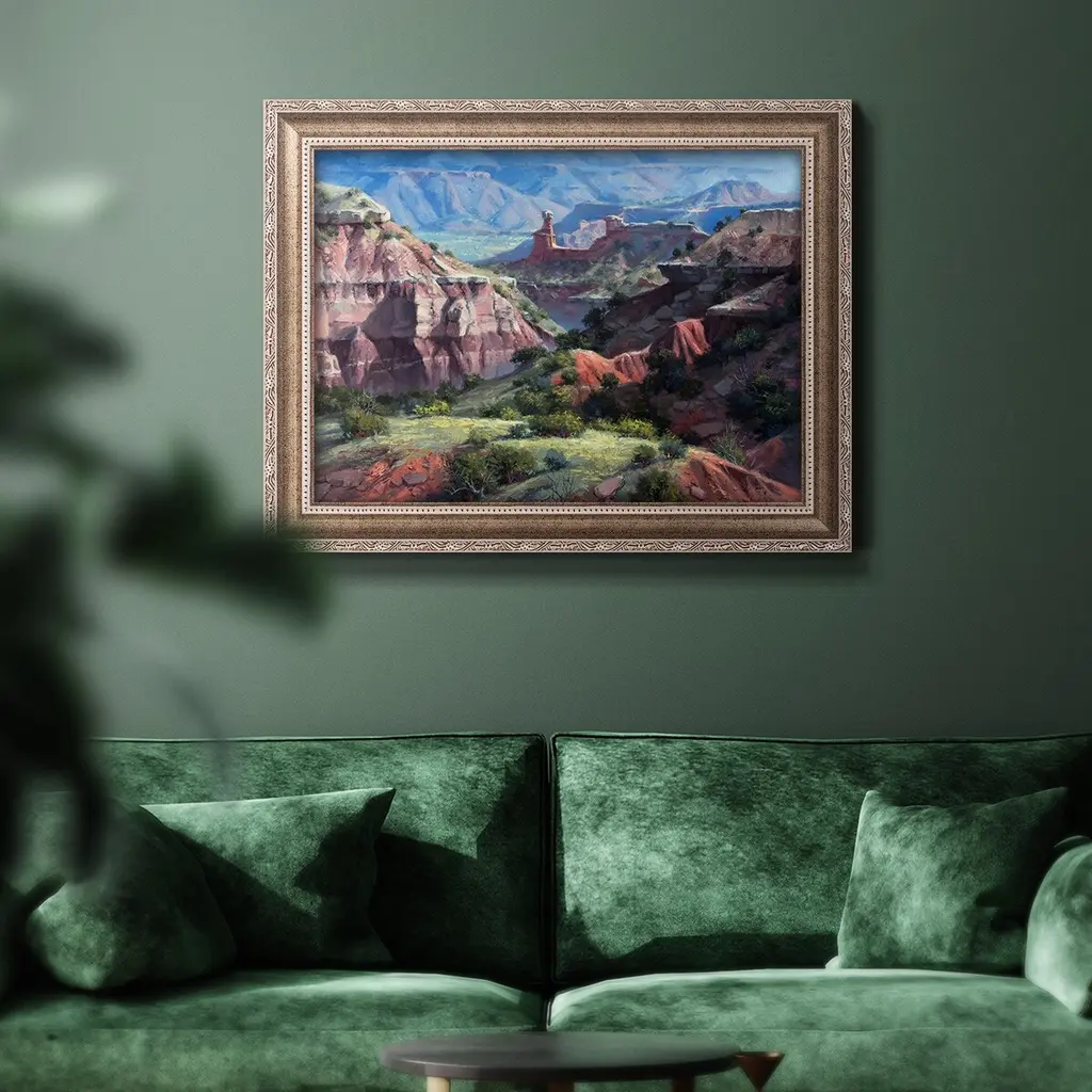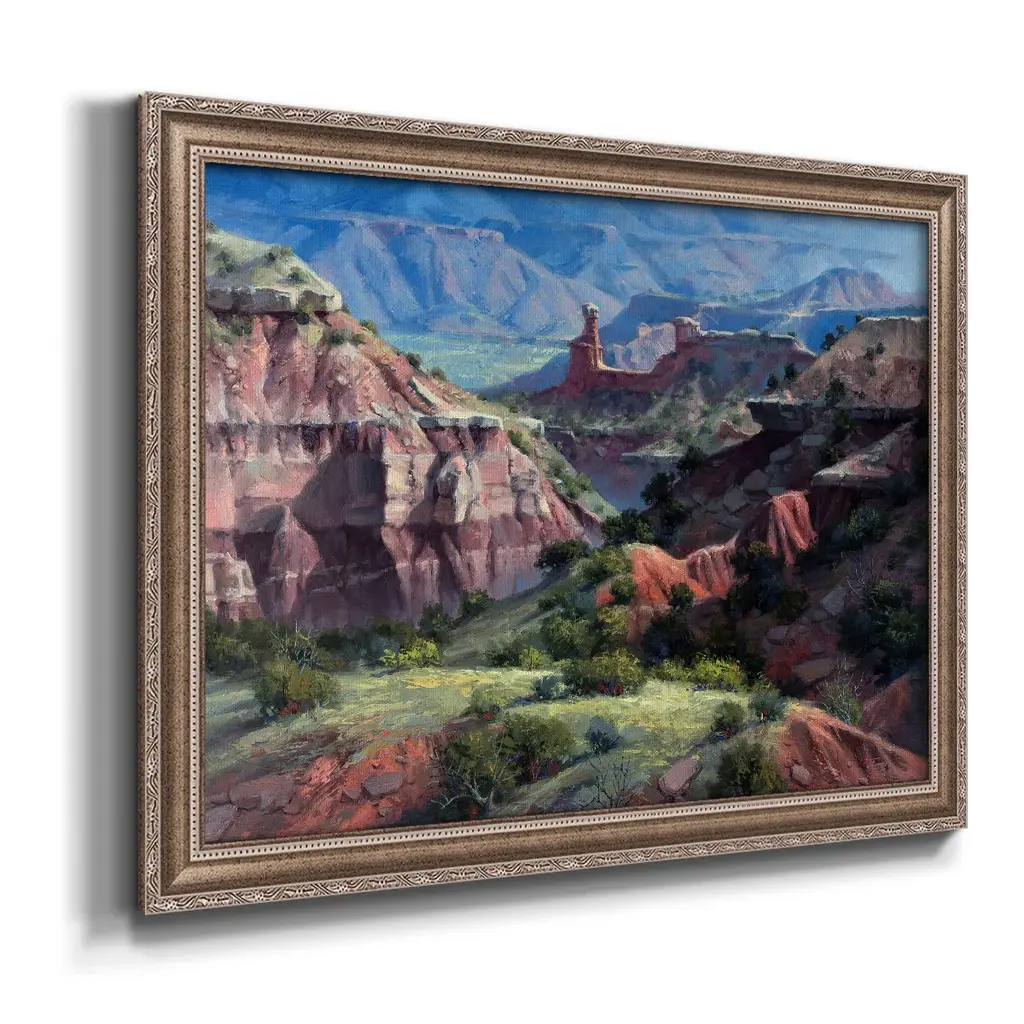 Classic Palo Duro Premium Framed Canvas- Ready to Hang A Premium Framed Canvas created to last. Framed in distressed wood and available in an array of sizes and colors Featuring a beveled a solid wood stretcher bar, each piece comes ready to hand 3 SIZES AVAILABLE 16''X20'' - Overall Size 18'X27'' - Overall Size 24''x36'' - Overall Size Each piece is made to order. Each piece comes with hanging hardware. Made in the USA Ready to Hang Giclee Paper Print Acrylic Glass Beveled Matt Board