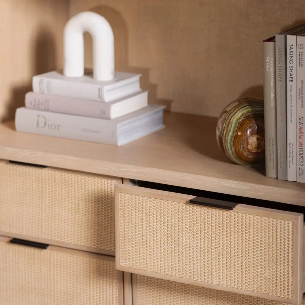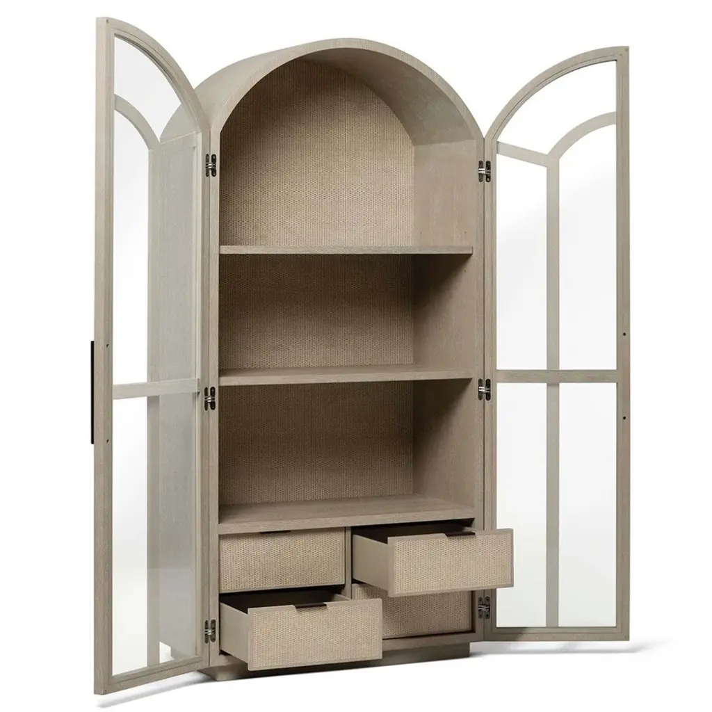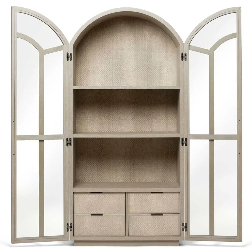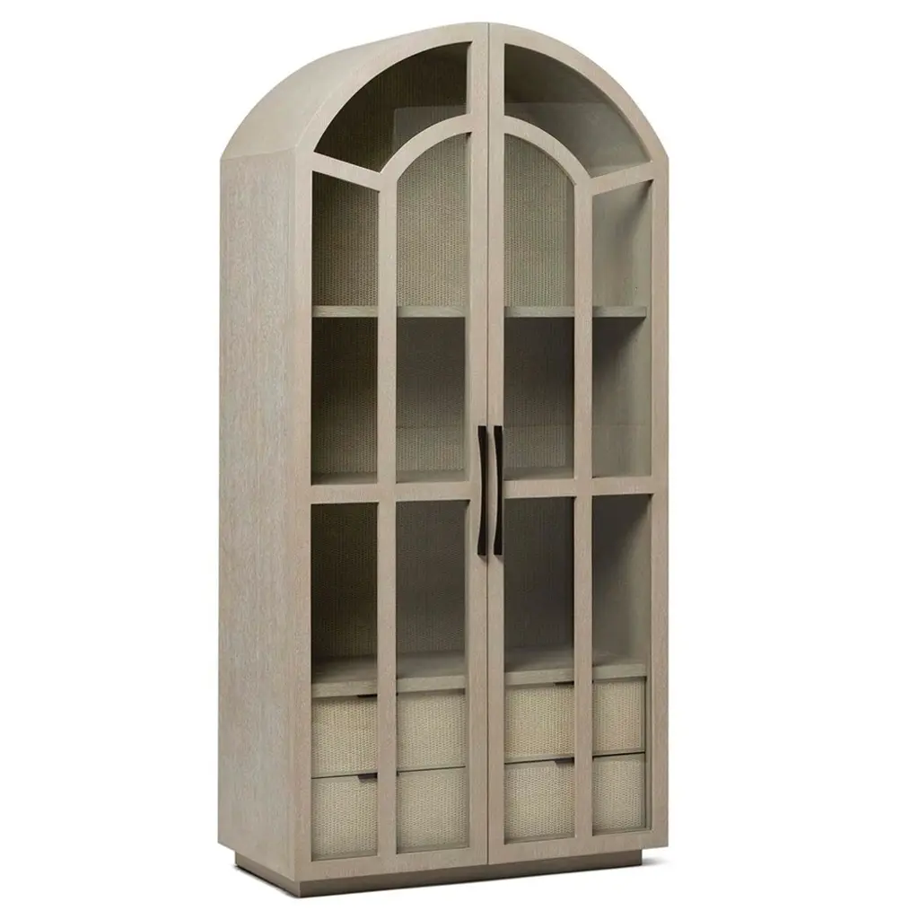 Claudine Modern Classic Cliffside Beige Wood Woven Rattan Arched Display Case