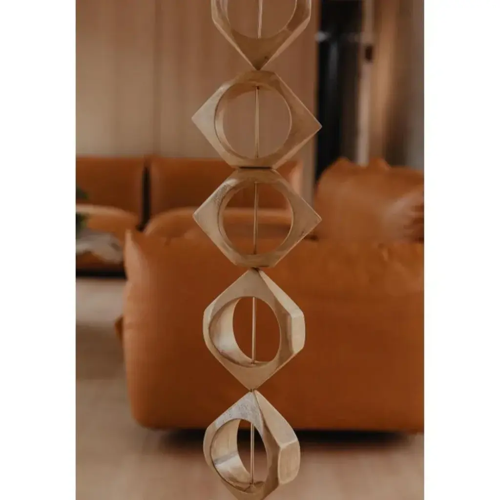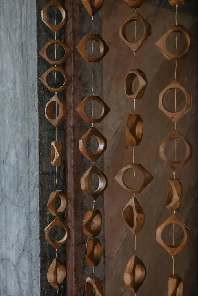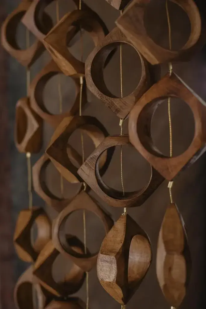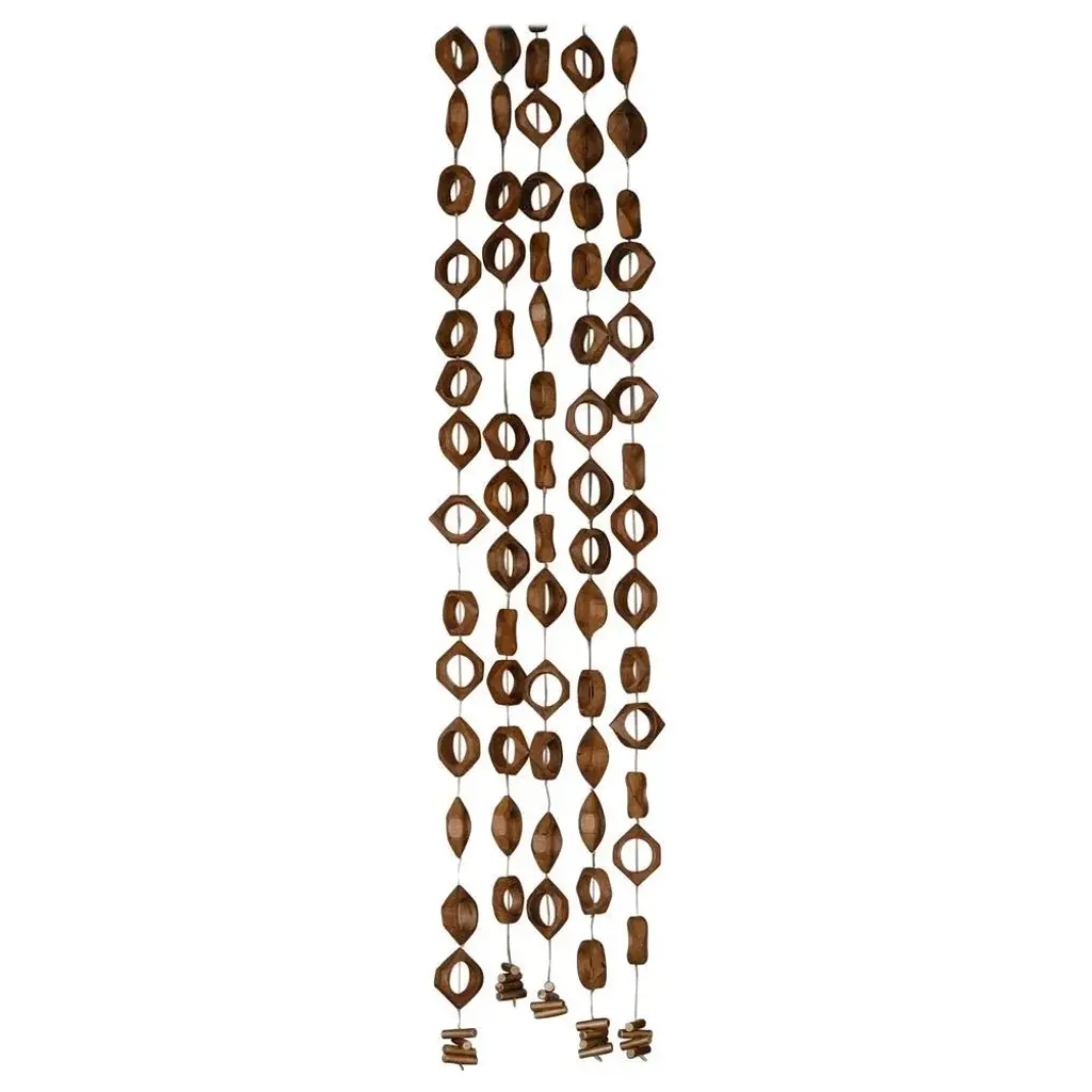Set Of 5 Claustra Room Dividers by Mylene Niedzialkowski Dimensions: W 12 x H 230 cm (each unit). Materials: Beech wood, golden steel wire and brass. Inspired by room dividers and certain bas reliefs from the 70s in the vast halls, Claustra is a string of wooden modules strung on a weighted metal cable. Sold "by the stem", Claustra is at its best when played in accumulation, as in the photos. It can be used as a room divider or as a wall decoration. Beech from eco-managed forest on steel cable, brass weight. Modules are 12cm wide. Hanging hook provided. Claustra is made at the Château de Méritein, our Béarnaise factory. The elements are varnished then mounted on cable.