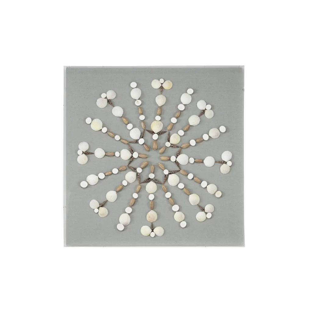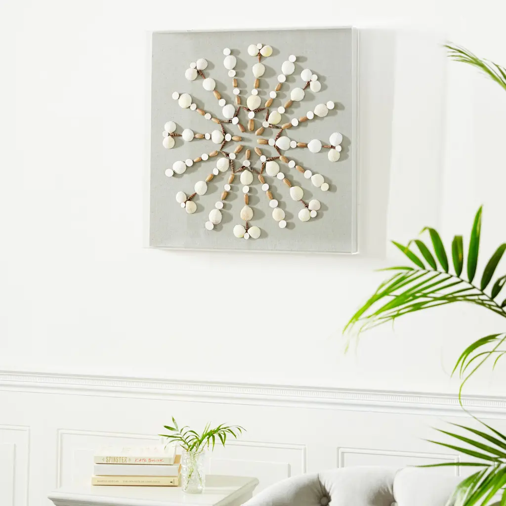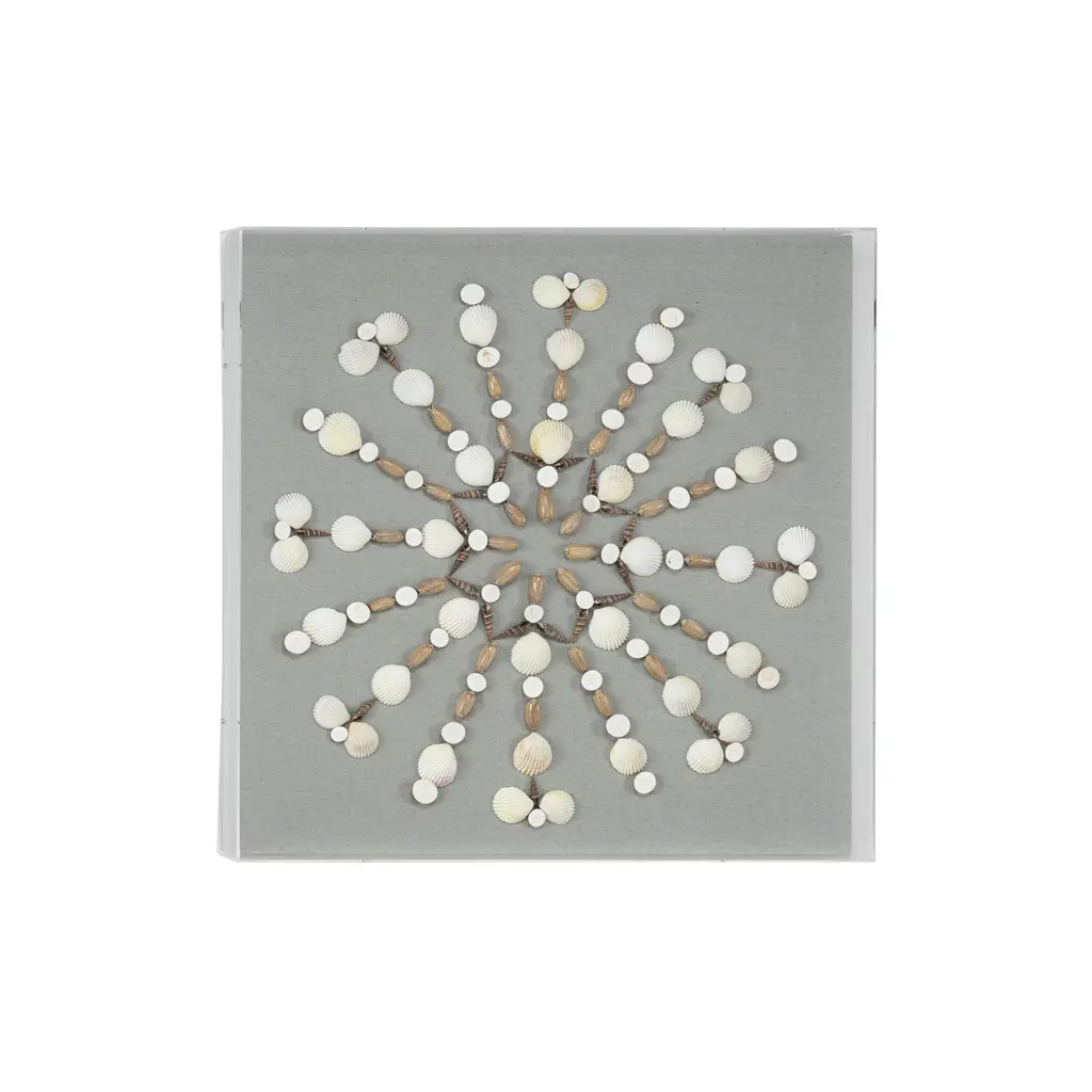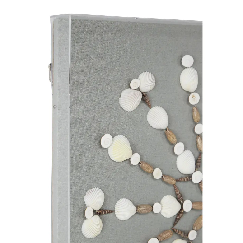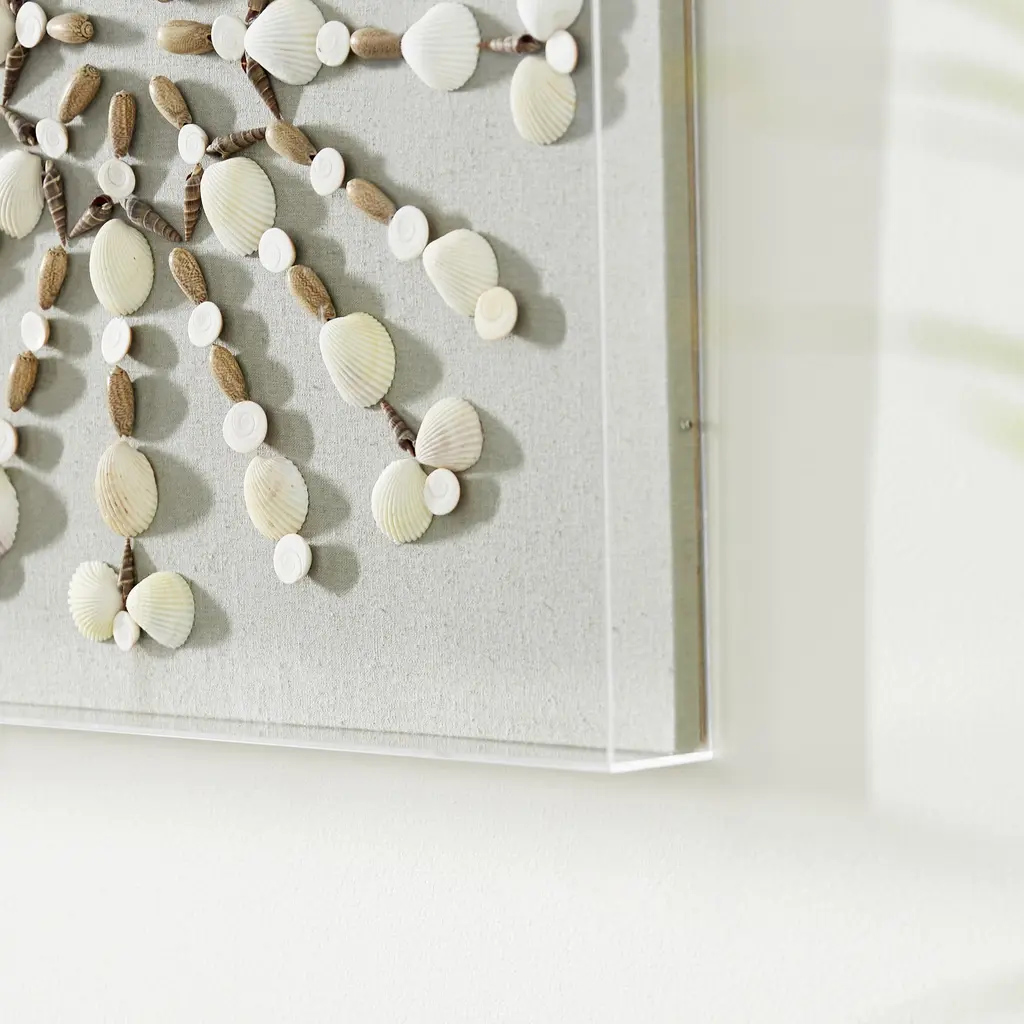 Shell wall sculpture can enhance living room or bedroom, adding depth and style to your interior. This item ships in 1 carton. Acrylic shadow box makes a great gift for any occasion. Can be hung horizontally or vertically using the d-rings; nails and screws not included. Suitable for indoor use only. This item ships fully assembled in one piece. This is a single clear colored wall decor. Coastal style.