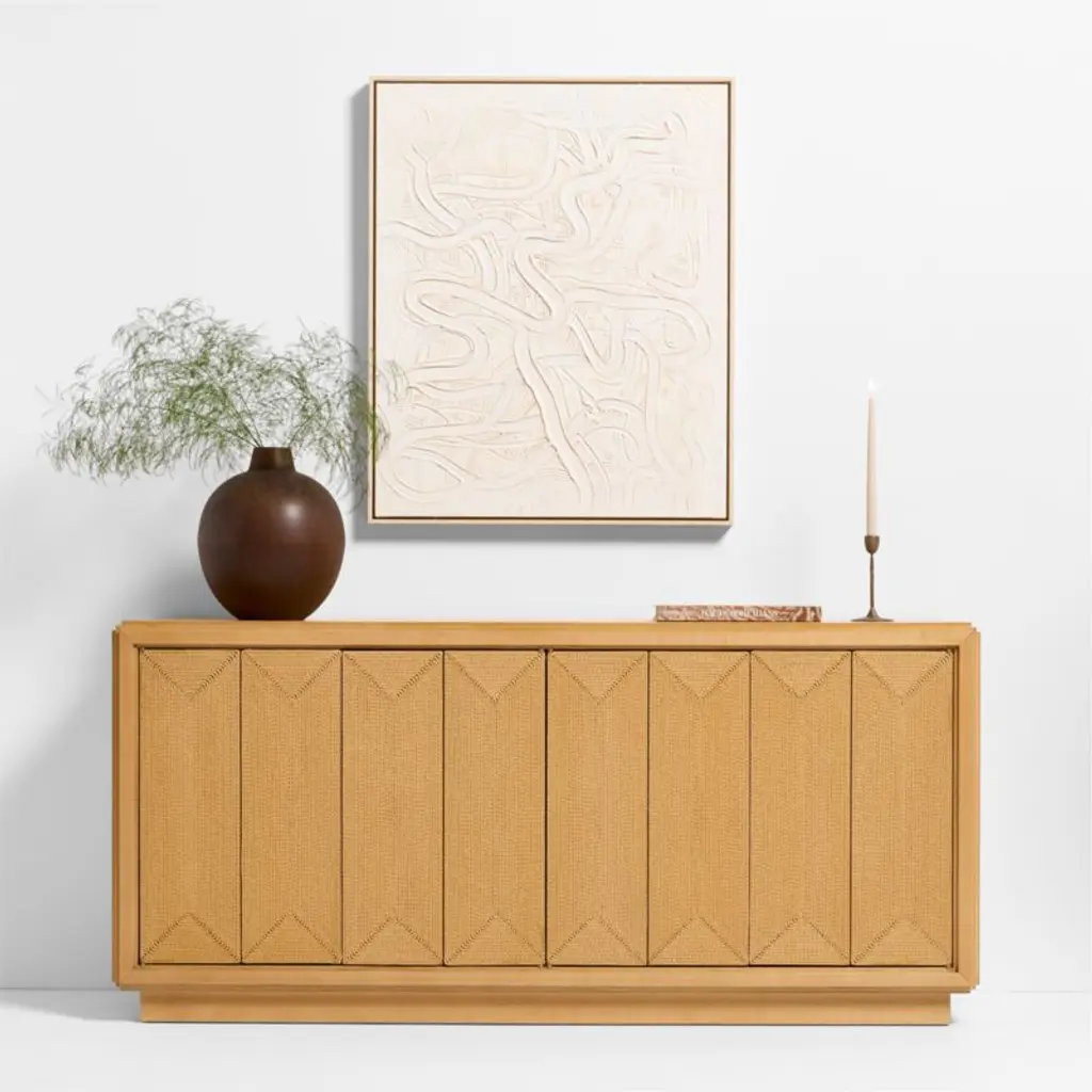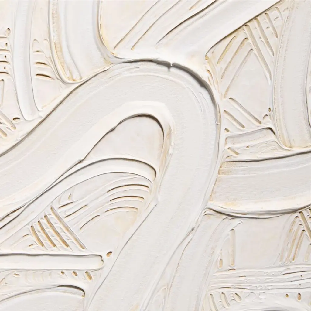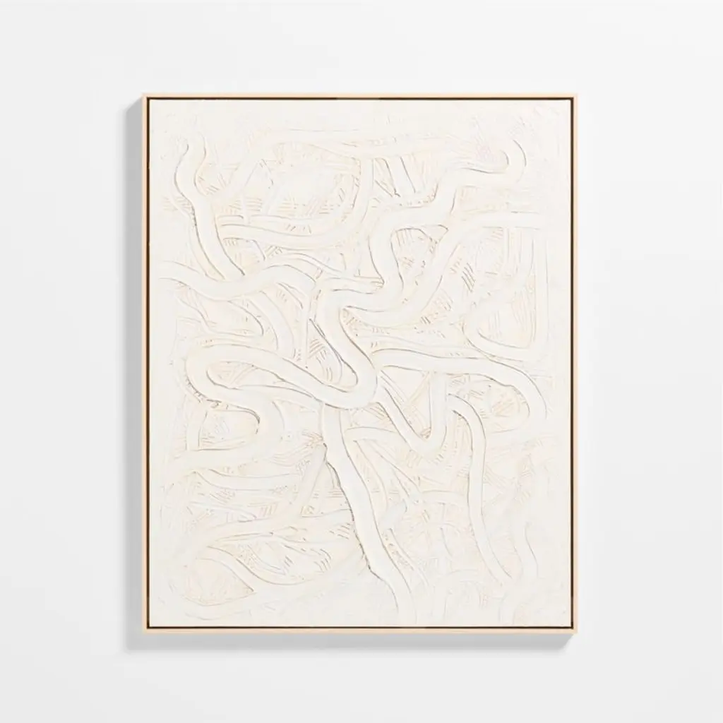 Joe Turner transforms white paint into a sculptural work of art with surprising depth. Meandering curvespaths, rivers or thoughts, perhapsintertwine, surrounded by dimensional crosshatches that create a rich surface. Painted by hand in thick acrylic paint on canvas, our reproduction captures the fascinating texture of the original. The long piece is presented in an understated wood floater frame that can be hung vertically or horizontally to suit your space and mood.