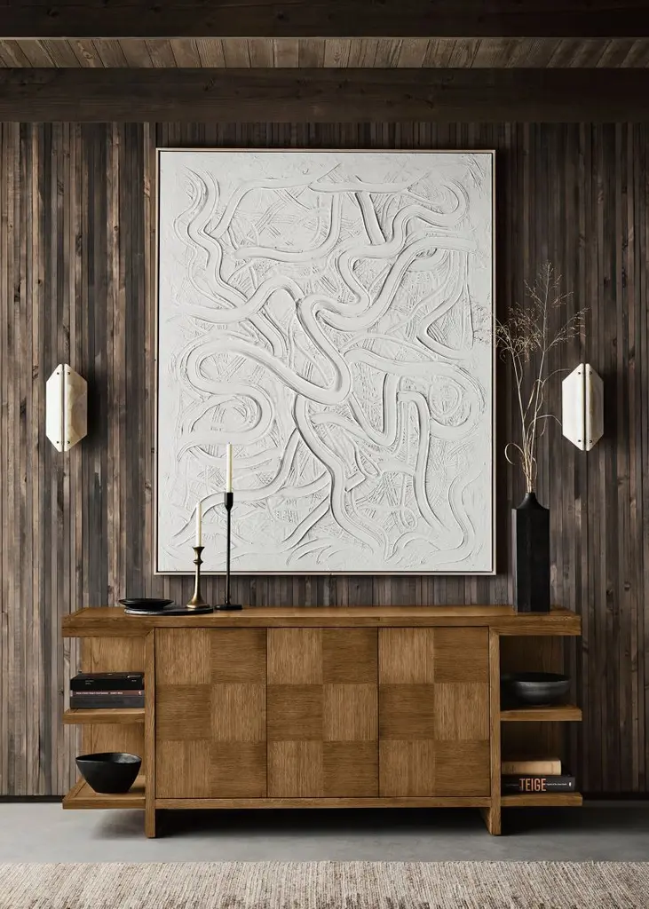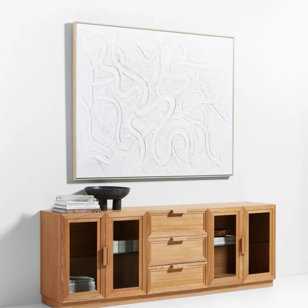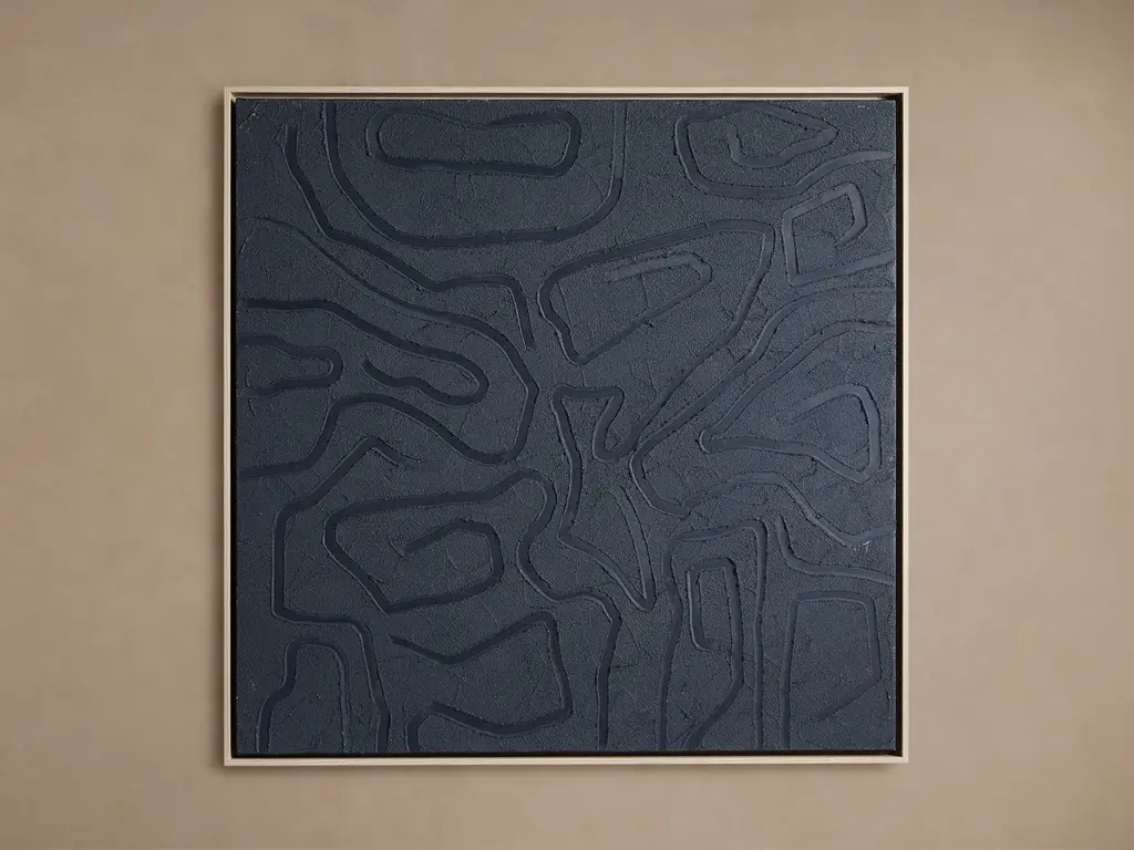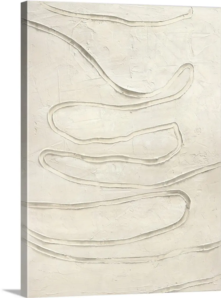 Joe Turner transforms white paint into a sculptural work of art with surprising depth. Meandering curvespaths, rivers or thoughts, perhapsintertwine, surrounded by dimensional crosshatches that create a rich surface. Painted by hand in thick acrylic paint on canvas, our reproduction captures the fascinating texture of the original. The long piece is presented in an understated wood floater frame that can be hung vertically or horizontally to suit your space and mood.