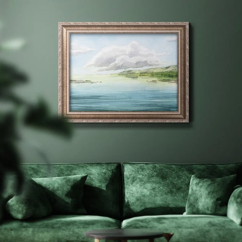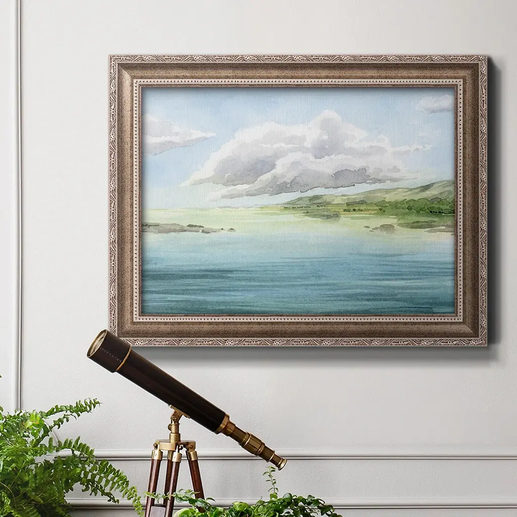 Clear Lagoon I Premium Framed Canvas- Ready to Hang A Premium Framed Canvas created to last. Framed in distressed wood and available in an array of sizes and colors Featuring a beveled a solid wood stretcher bar, each piece comes ready to hand 3 SIZES AVAILABLE 16''X20'' - Overall Size 18'X27'' - Overall Size 24''x36'' - Overall Size Each piece is made to order. Each piece comes with hanging hardware. Made in the USA Ready to Hang Giclee Paper Print Acrylic Glass Beveled Matt Board