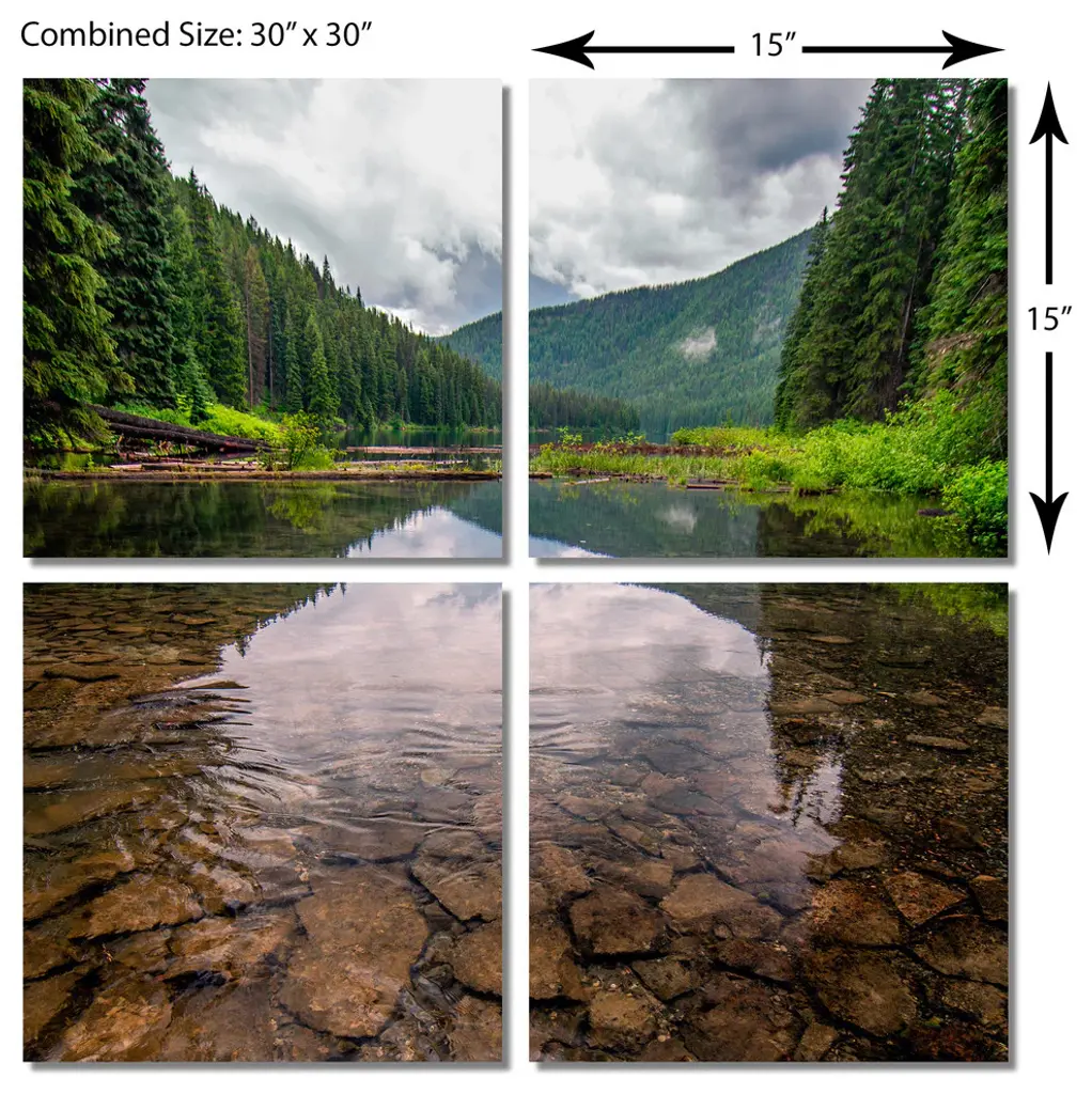 30"œ x 30"œ total size. Ready To Hang! (4 pieces - 15"œ x 15"œ each). 4 Panel Split (Quad) Metal Print of a clear, shallow lake in the mountains. Modern metal wall art for home or office wall decor & interior design. Printed on Luxurious, HD aluminum glossy metal panels. Multi panel art.. HD aluminum panels. Metal print wall art. Includes Shadow Wall Mount on the back.• Aluminum Metal Wall Art• Made in USA• Ready to hang - No assembly required• Shadow mount hardware on the back• 0.045"œ thick HD Aluminum Panels• Scratch resistant, glossy finish• Superb color clarity, luxurious prints• Epson printing process• For indoor or moisture rich environment use• Easy to clean. Gently wipe with microfiber cloth.