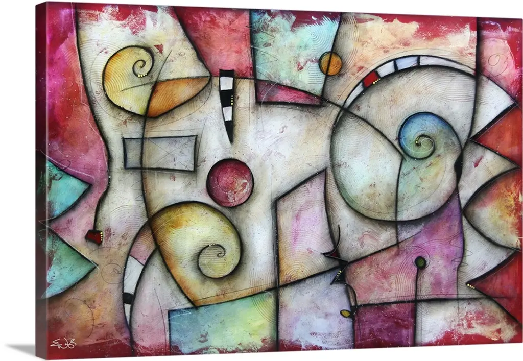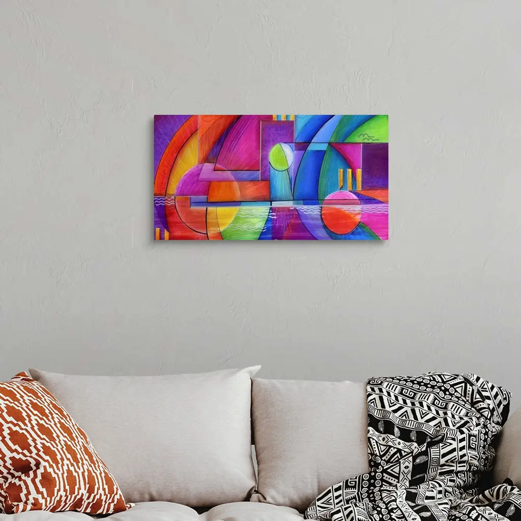 Horizontal abstract painting of vibrant colored shapes in circles and triangles.
