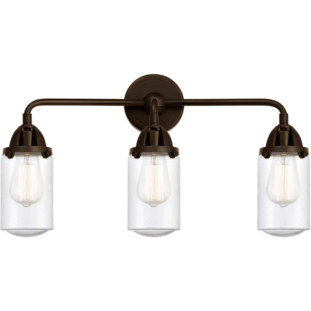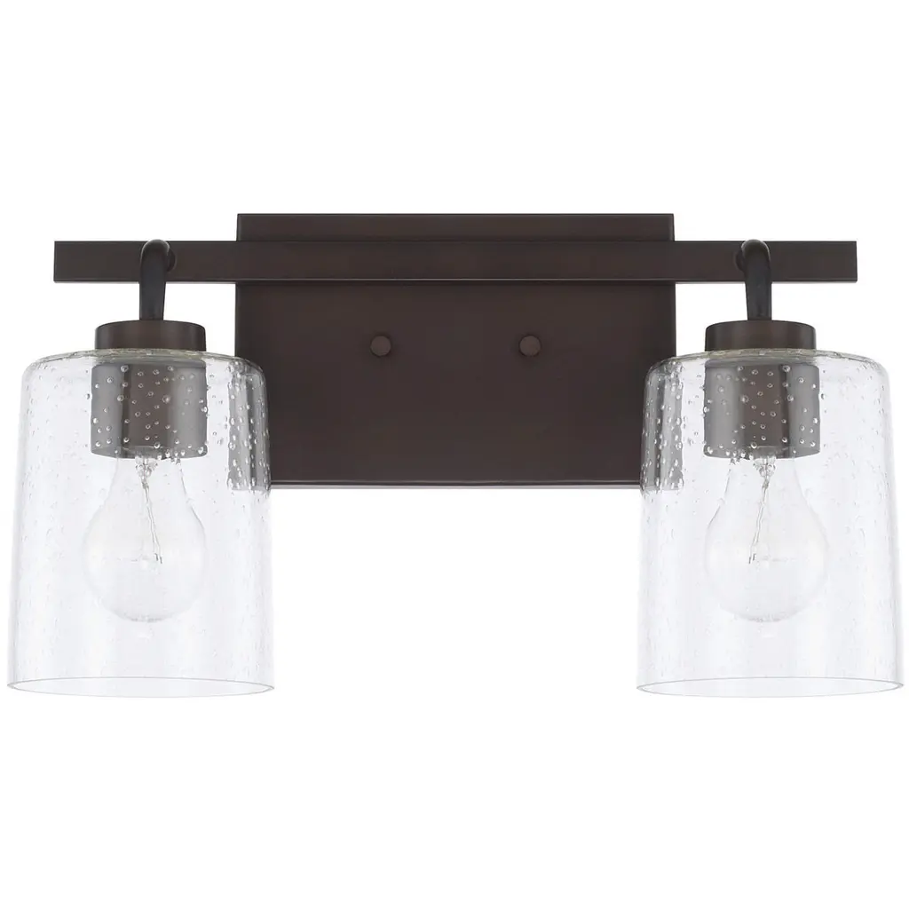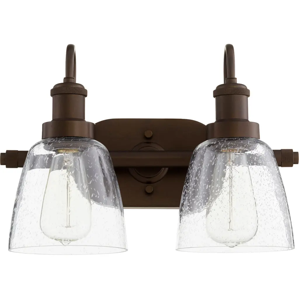 A multi-textured piece full of confidence and refined design. Set your bathroom off as the Clear Seeded Vanity Light from Quorum International rests handsomely over your mirror. A stylish circular backplate mounts against the wall without taking up too much space. Crisp, industrial-inspired lamp holders arch from a tubular crossbar, showcasing bold, knurled accents made in a specialized mechanical process. A radiant light glazes across your figure with a sense of warmth, filtered through the shimmering surfaces of a clear seeded glass shade.