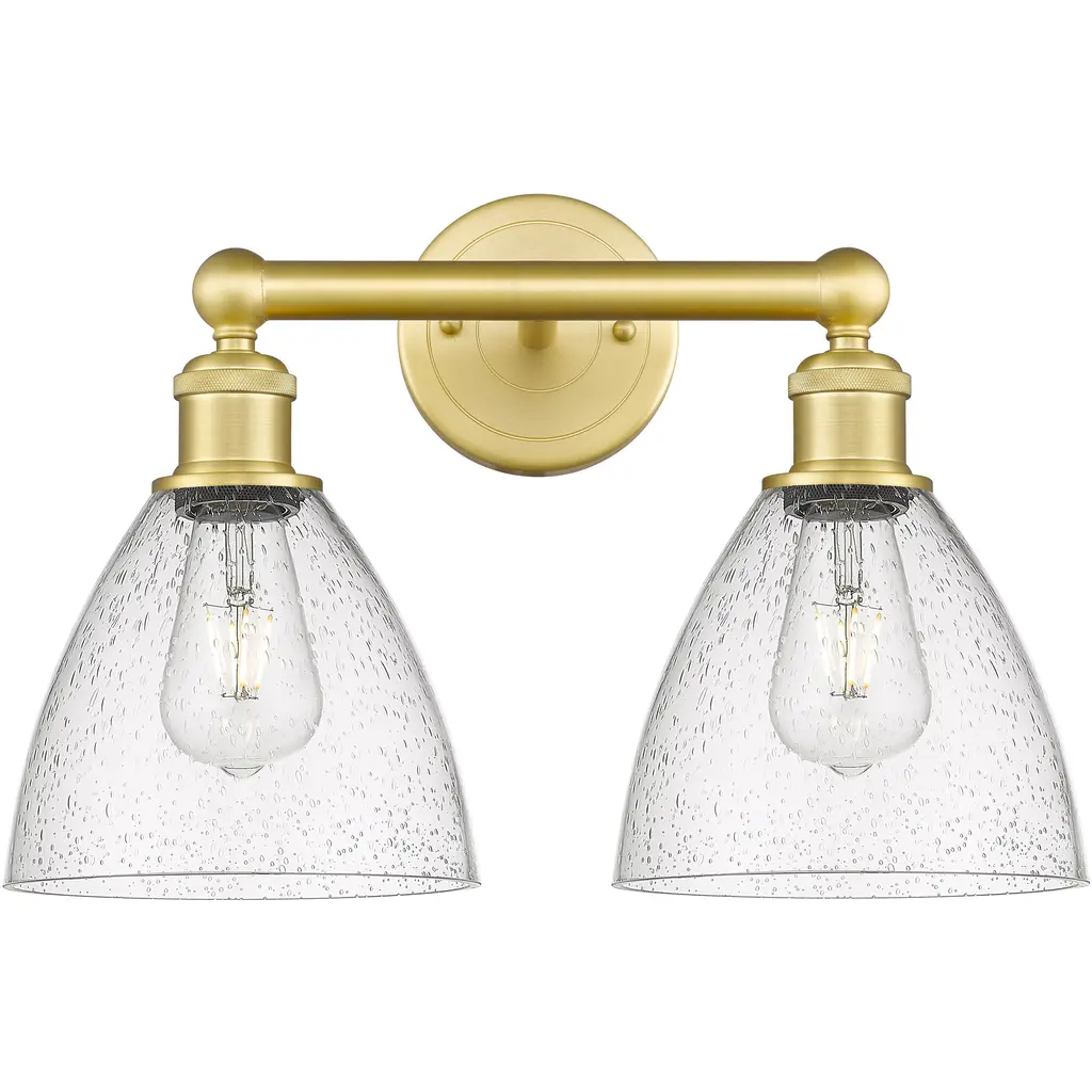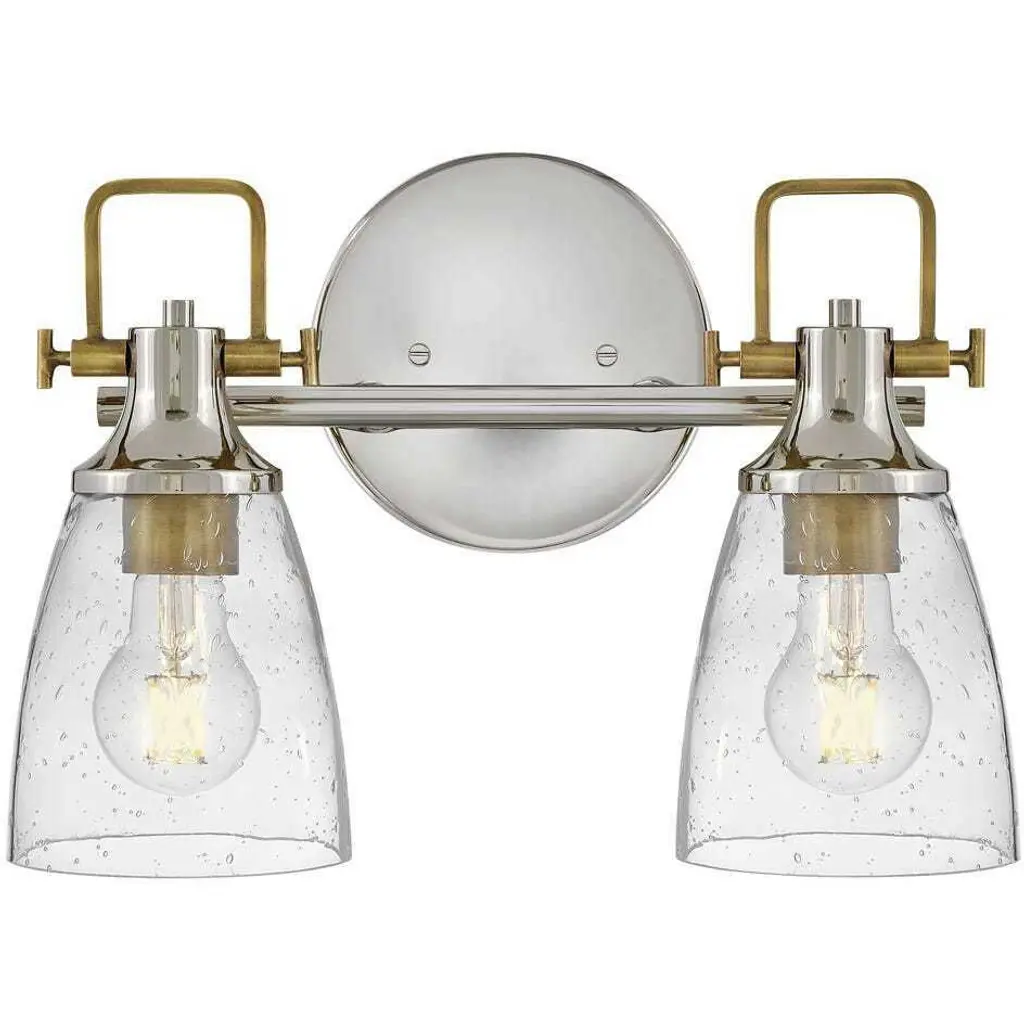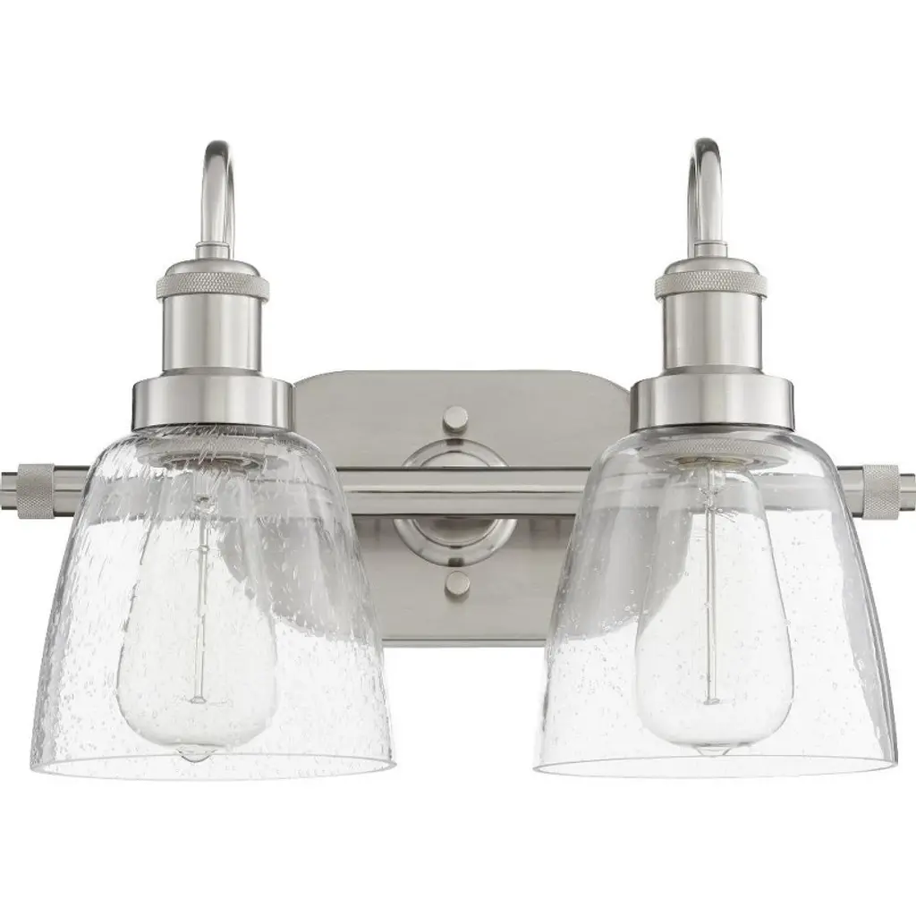A multi-textured piece full of confidence and refined design. Set your bathroom off as the Clear Seeded Vanity Light from Quorum International rests handsomely over your mirror. A stylish circular backplate mounts against the wall without taking up too much space. Crisp, industrial-inspired lamp holders arch from a tubular crossbar, showcasing bold, knurled accents made in a specialized mechanical process. A radiant light glazes across your figure with a sense of warmth, filtered through the shimmering surfaces of a clear seeded glass shade.