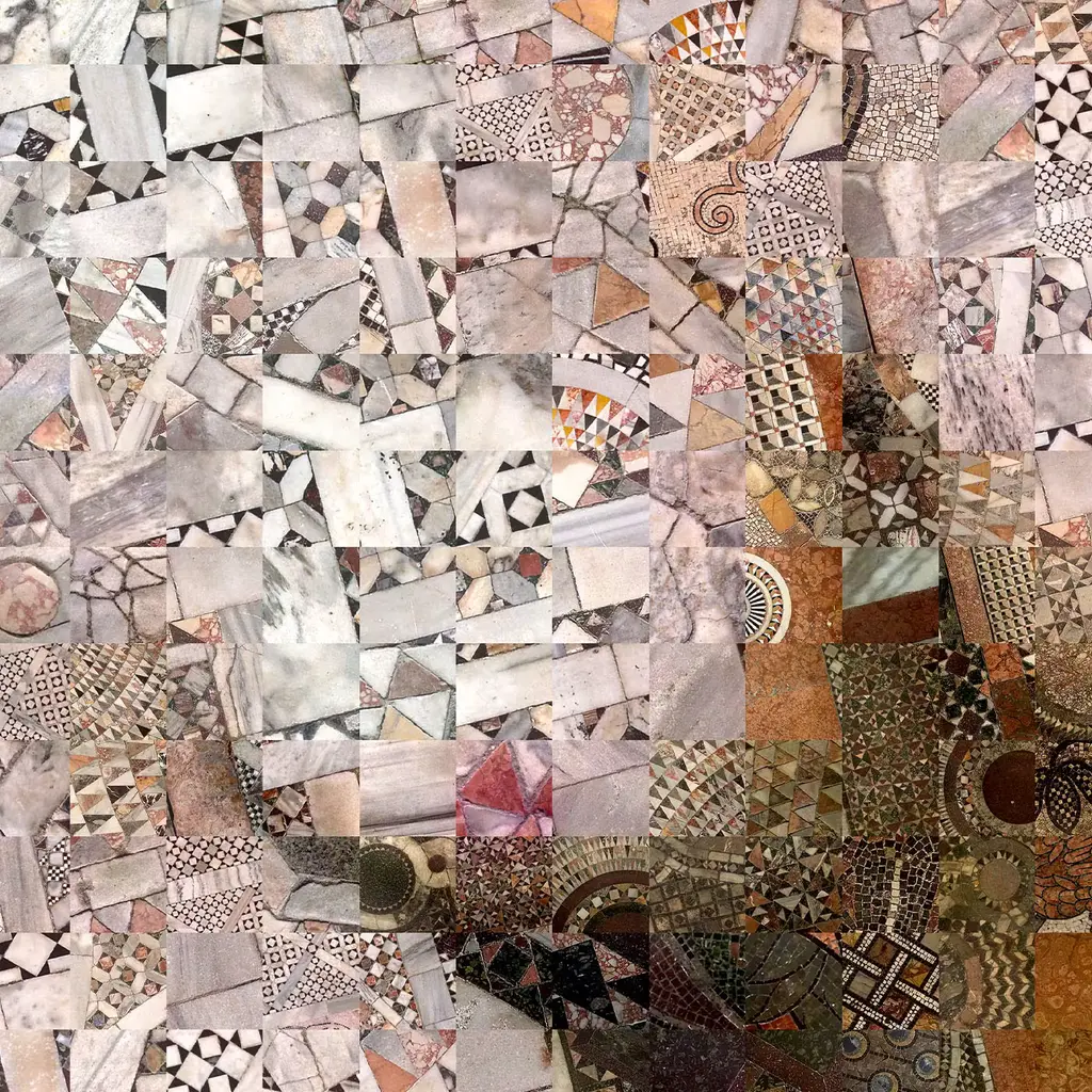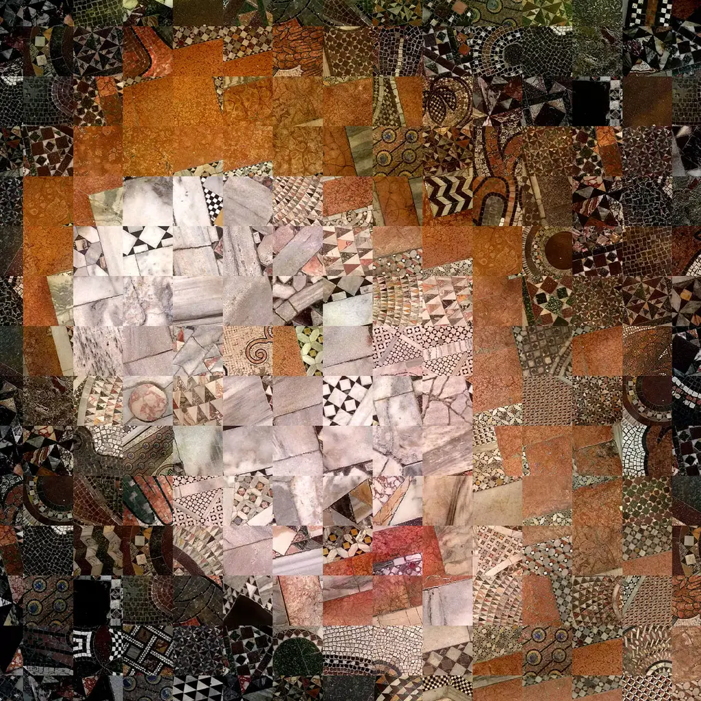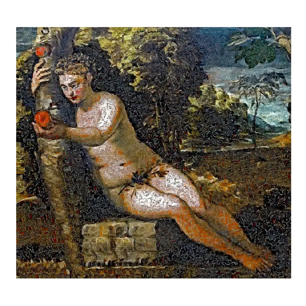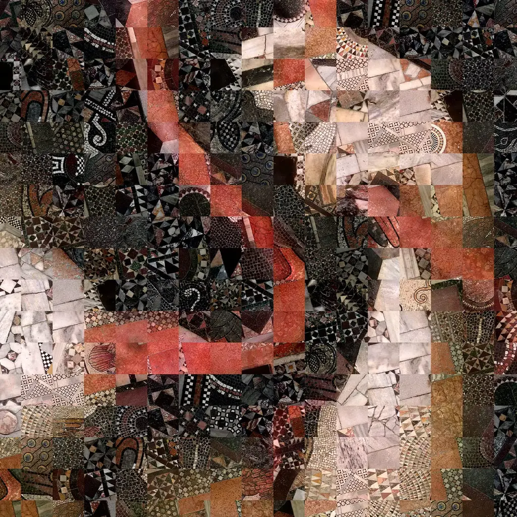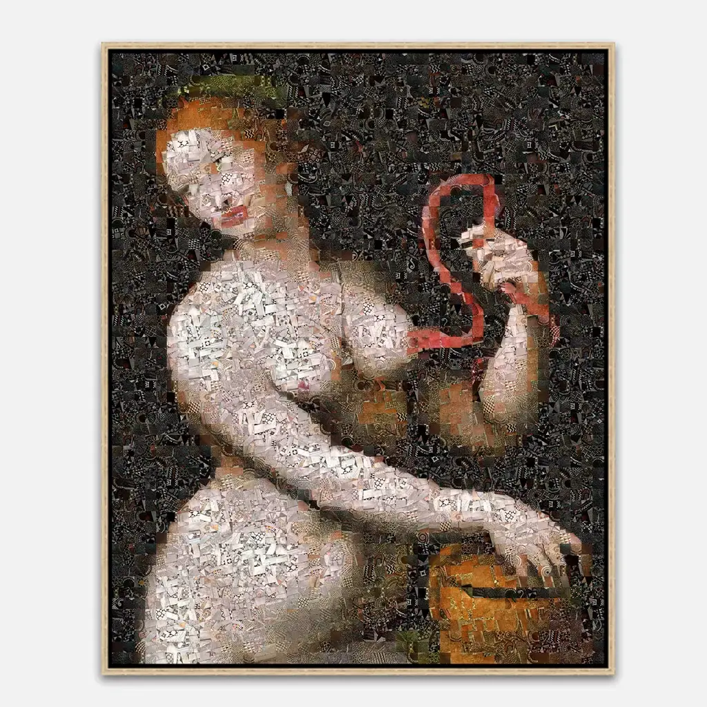 Cleopatra is composed of 4.347 photographic tiles of the mosaic floor of St. Mark’s Basilica in Venice that have been used to elaborate this work provided with a double certificate of authenticity and uniqueness countersigned by the artist and blockchain registered. The work can be ordered with a handcrafted wood frame. Revisiting Giampietrino’s "Death of Cleopatra" 95×76 cm 2023, pigment print on fine art paper, acrylic glass, aluminum. Please ask the Concierge service for further information.