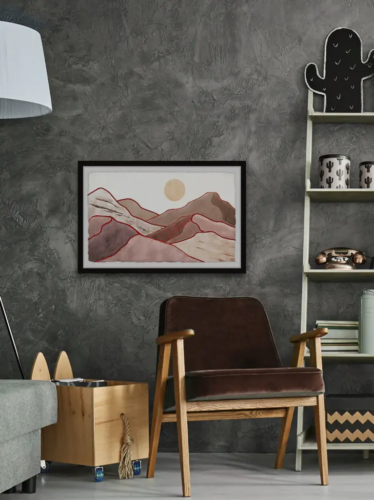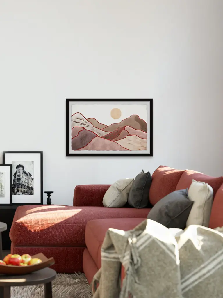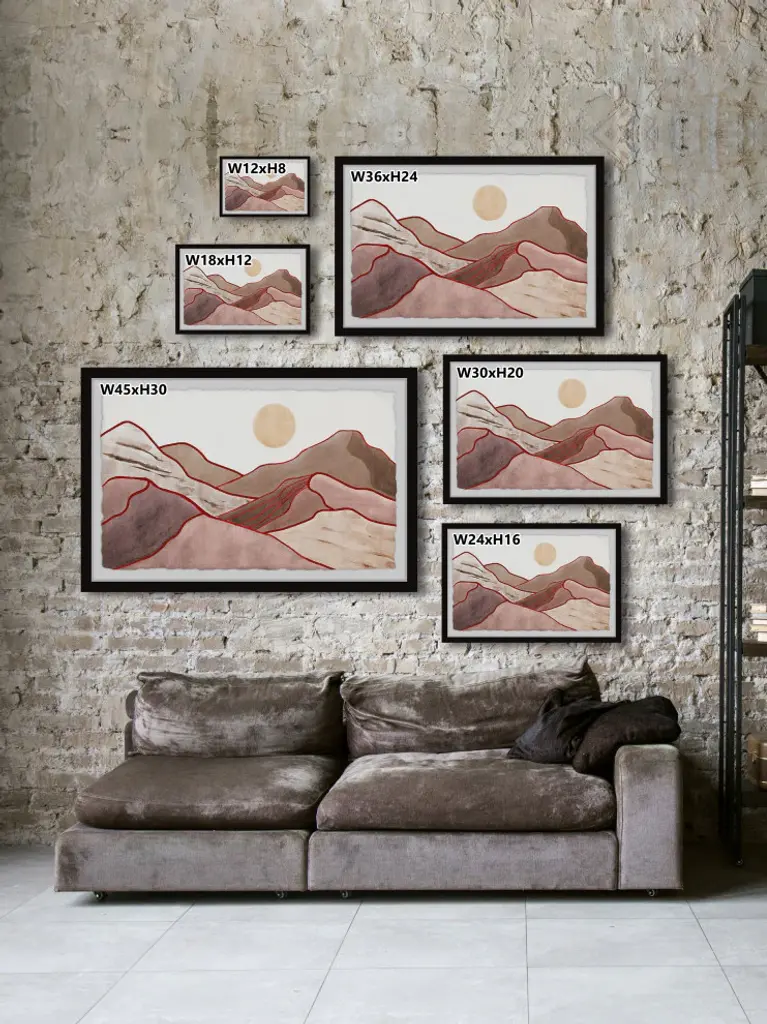 Make your space feel more worldly with this watercolor painting print that features scattered mountains and a large sun in the sky. Proudly printed in the USA, this piece is printed on high quality archive paper and professionally hand-framed. With wall-mounting hooks included, this artful accent is ready to hang up as soon as it reaches your front door.- Top quality Giclee print on high resolution Archive Paper- Hand cut deckled edges- High quality durable non-warping frame- Finished under shatter resistant plexiglass- Arrives ready to hang- Includes a certificate of authenticity- Printed in the USA