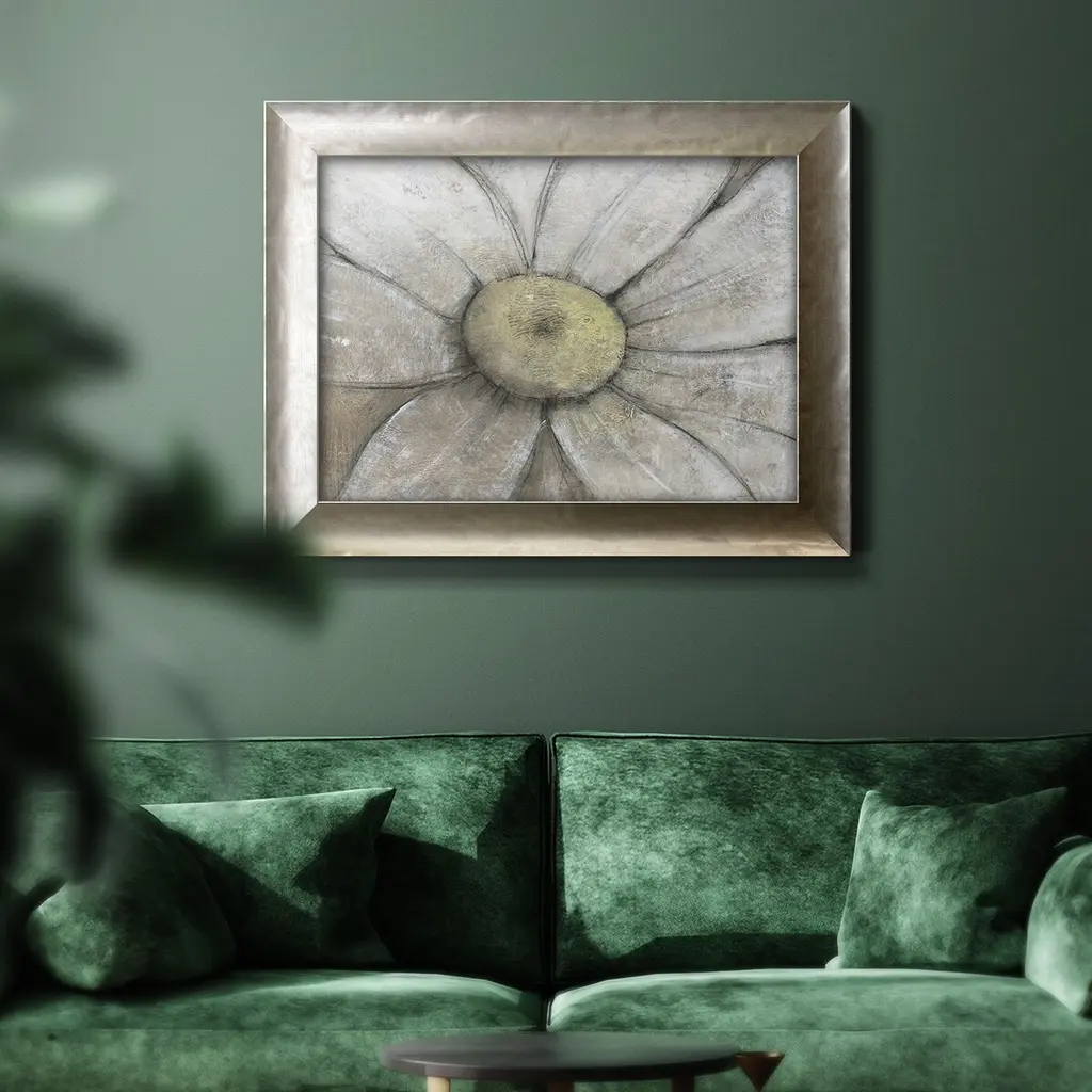 Close-Up Daisy II Premium Framed Canvas- Ready to Hang A Premium Framed Canvas created to last. Framed in distressed wood and available in an array of sizes and colors Featuring a beveled a solid wood stretcher bar, each piece comes ready to hand 3 SIZES AVAILABLE 16''X20'' - Overall Size 18'X27'' - Overall Size 24''x36'' - Overall Size Each piece is made to order. Each piece comes with hanging hardware. Made in the USA Ready to Hang Giclee Paper Print Acrylic Glass Beveled Matt Board