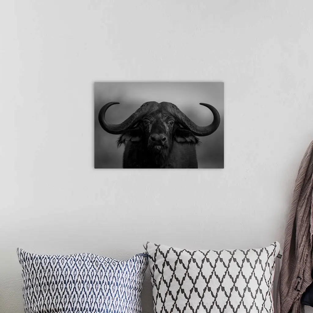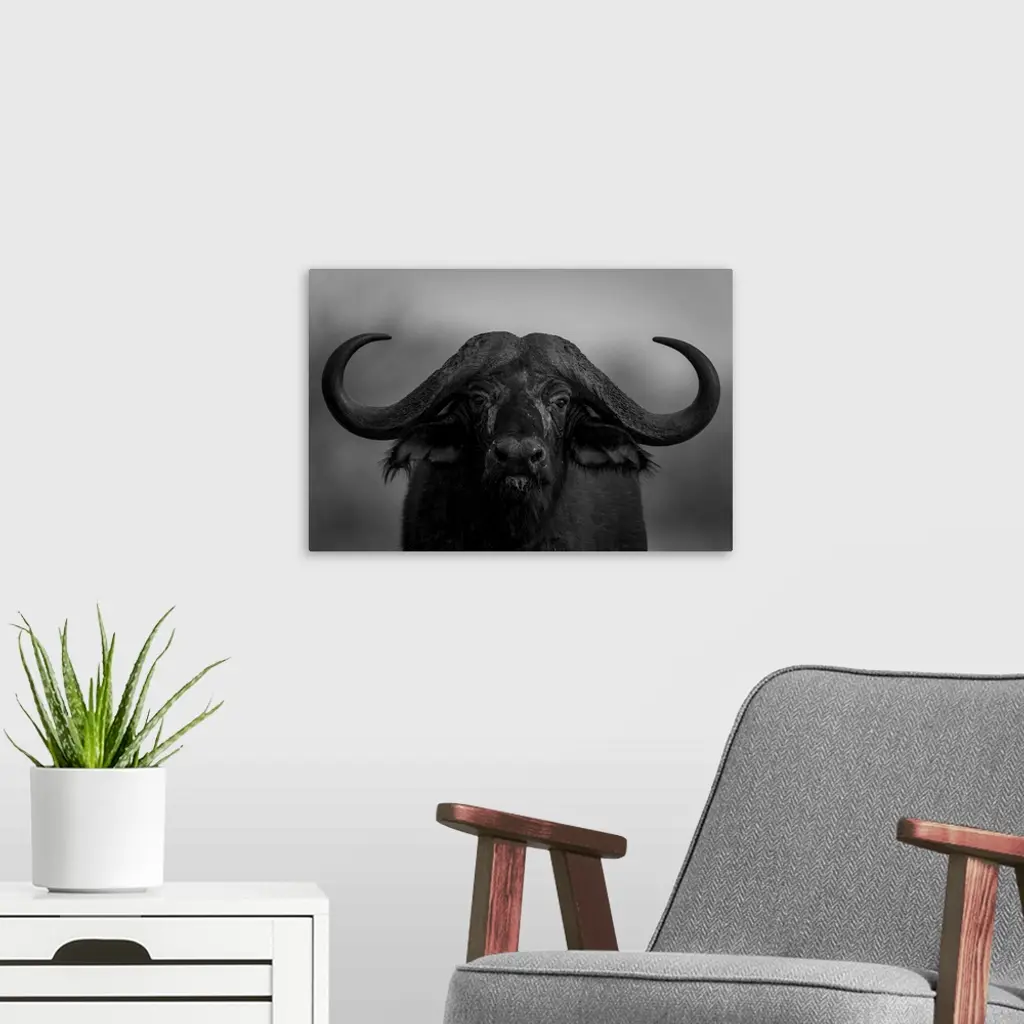 Mono, close-up portrait of a Cape Buffalo (Syncerus caffer) standing, eyeing camera in Segera, Segera, Laikipia, Kenya