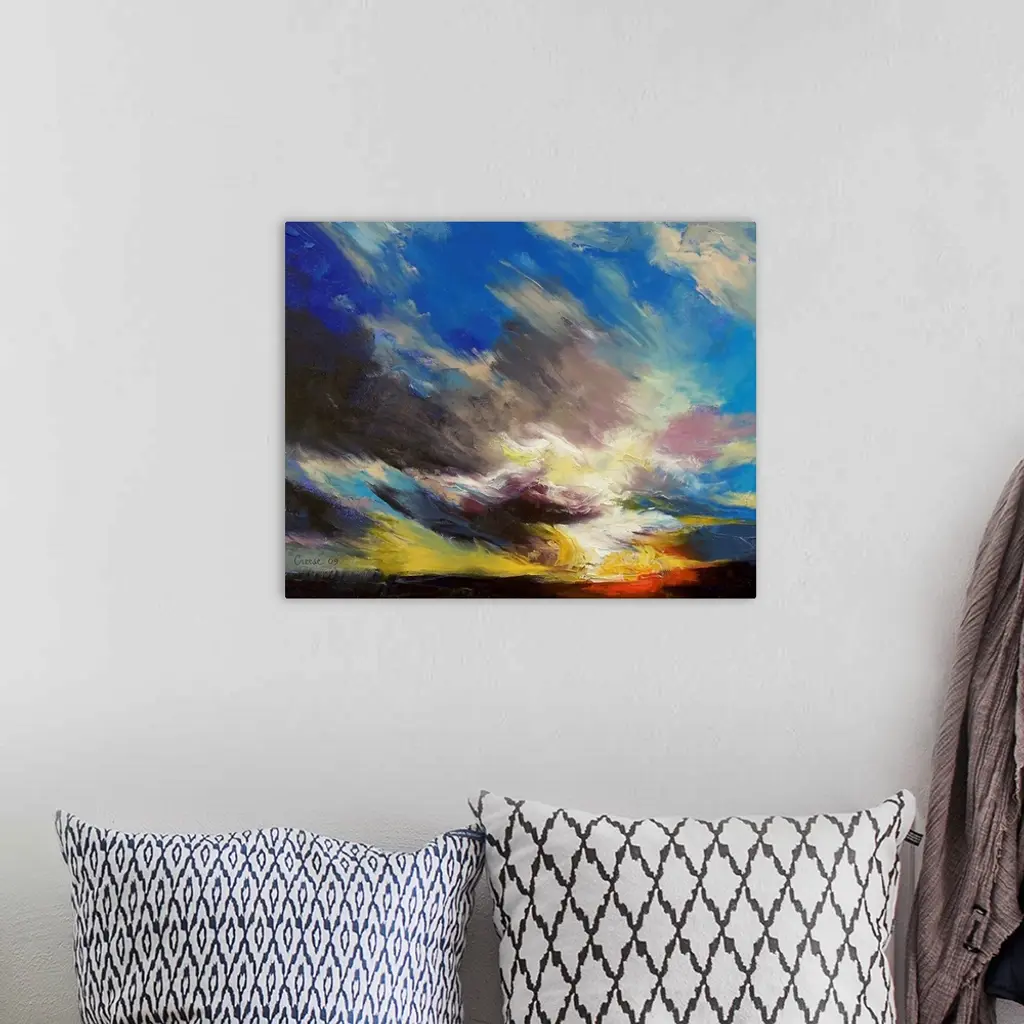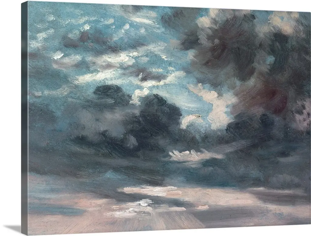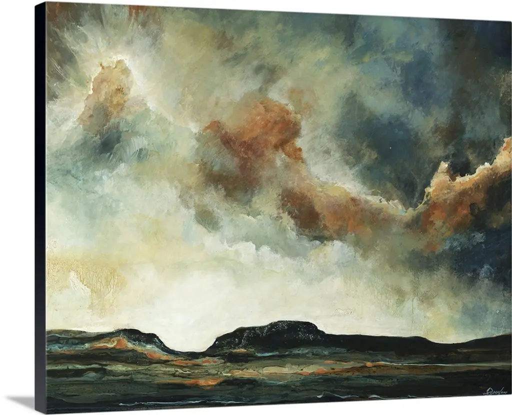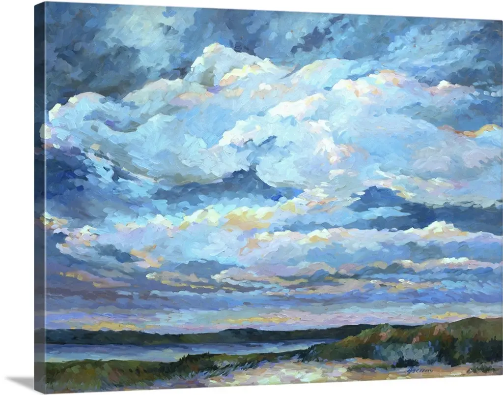 Giclee print of a landscape oil painting with big, bold brush strokes of clouds in the sky.