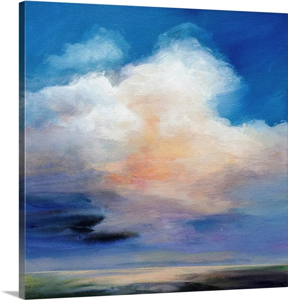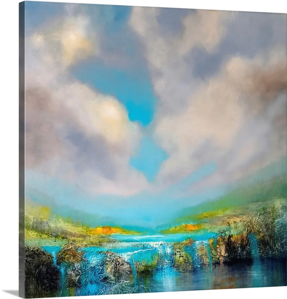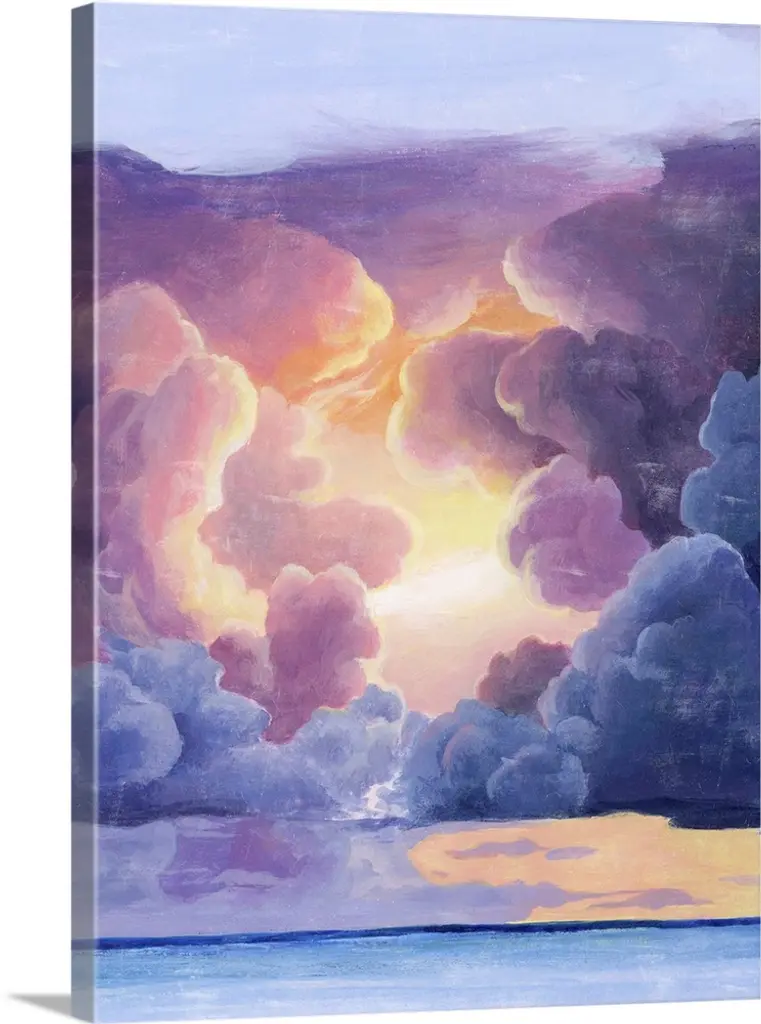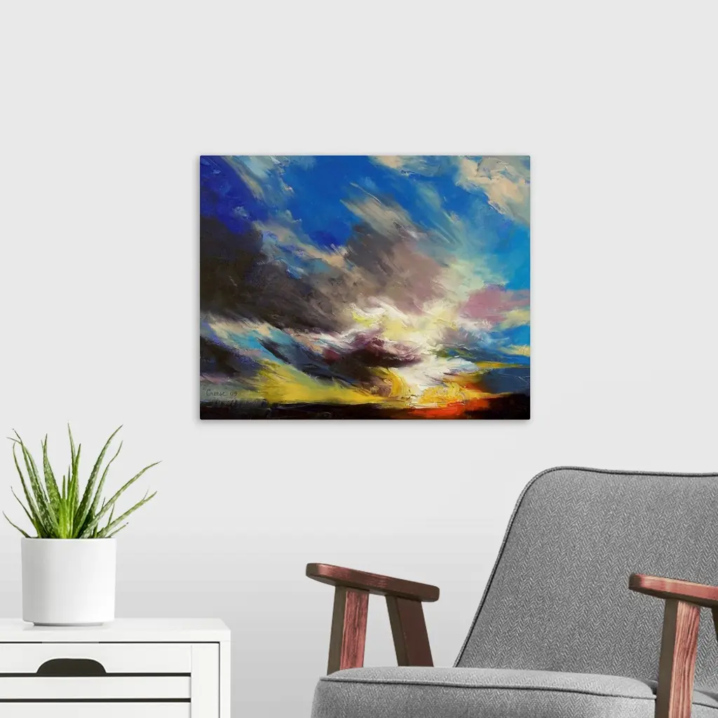 Giclee print of a landscape oil painting with big, bold brush strokes of clouds in the sky.