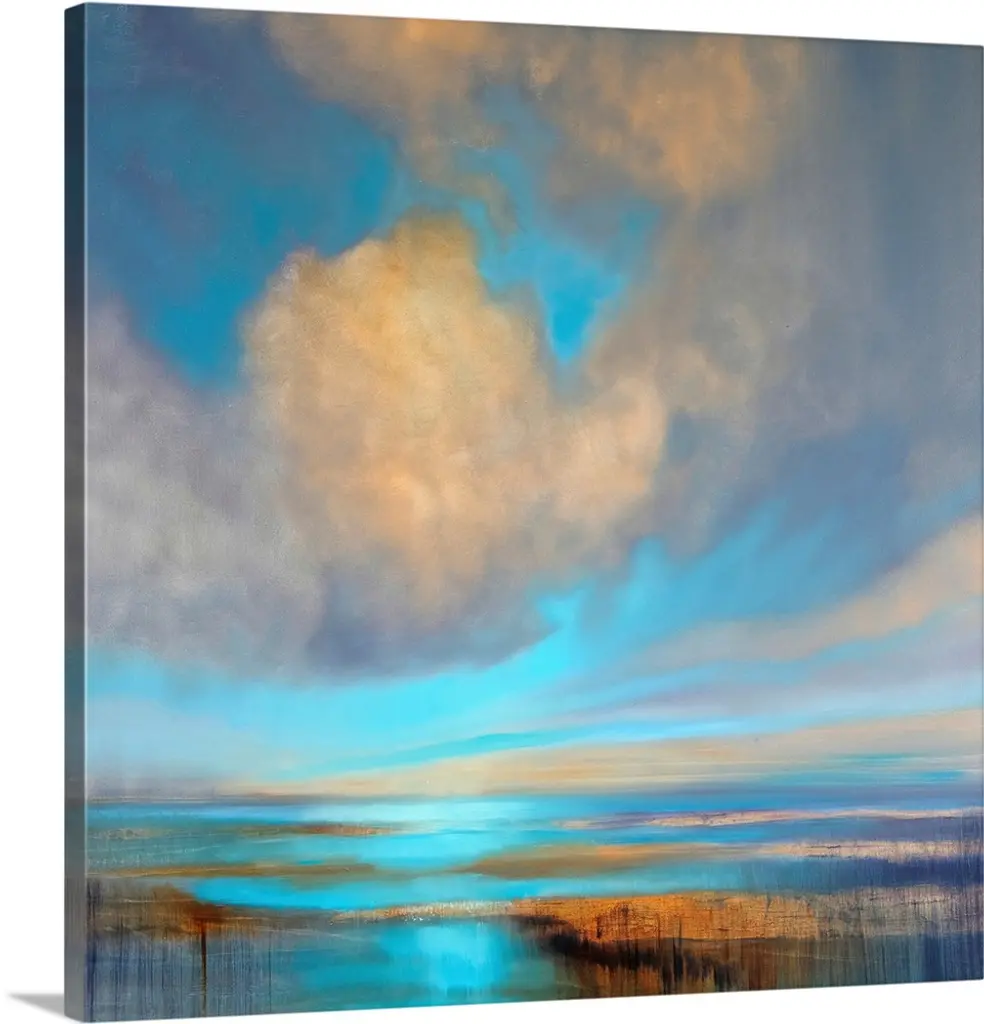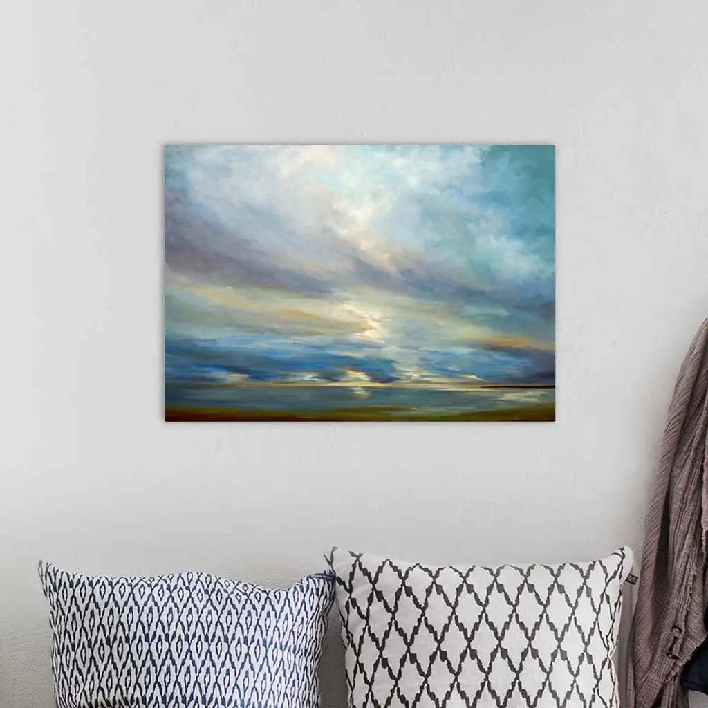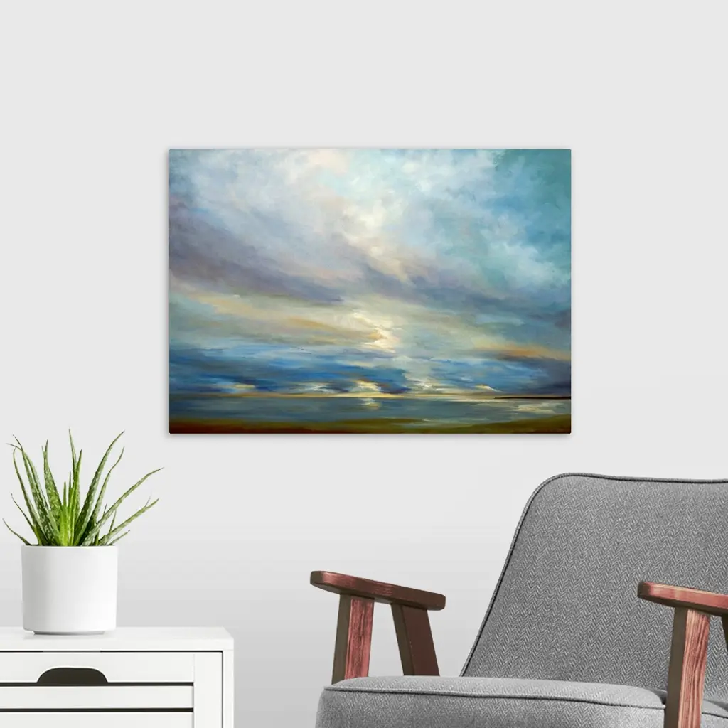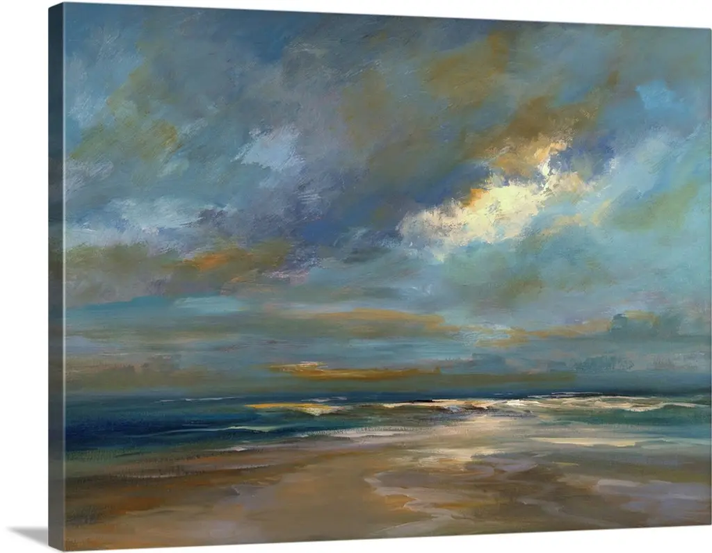 Contemporary seascape painting of sunlight shining though clouds over the ocean.