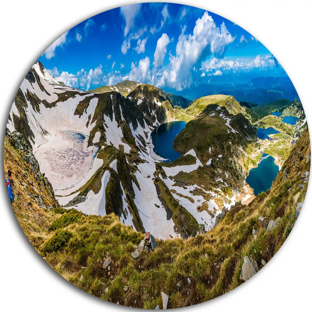 Bring Contemporary Abstraction to your home with this large Circle Metal wall art. This Clouds Over Seven Rila Lakes Metal Artwork makes it the focal point of any room or office. - White Gloss Coating ensures colors are extra vibrant with light reflection.- Aluminum grade Sheet Metal with 1 inch mounting frame on the back giving the illusion that the artwork is floating on the wall..- Mounting Brackets are included along with instructions.- High Quality Digital images are created directly into a glossy aluminum panel producing a stunning and captivating print into the glossy finish of the metal.- Water, Fire and Scratch resistant HD Aluminum panels.- Looks better than any photo paper and guaranteed to last at least 20 years- Easy to clean with a microfiber cloth. Colors are far superior to regular Canvas Art. - Easy to Hang