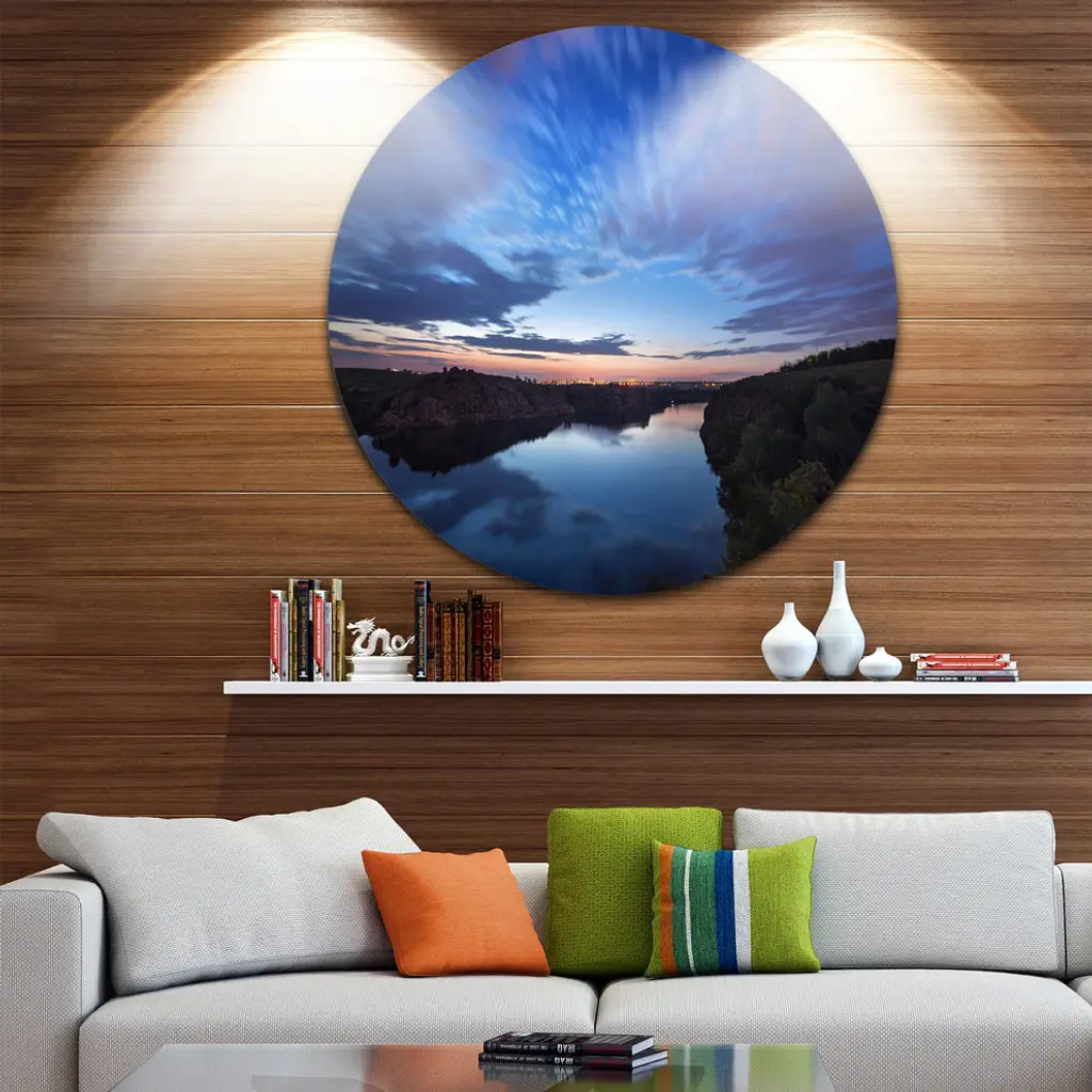 Bring Contemporary Abstraction to your home with this large Circle Metal wall art. This Clouds Reflection in River Metal Artwork makes it the focal point of any room or office. - White Gloss Coating ensures colors are extra vibrant with light reflection.- Aluminum grade Sheet Metal with 1 inch mounting frame on the back giving the illusion that the artwork is floating on the wall..- Mounting Brackets are included along with instructions.- High Quality Digital images are created directly into a glossy aluminum panel producing a stunning and captivating print into the glossy finish of the metal.- Water, Fire and Scratch resistant HD Aluminum panels.- Looks better than any photo paper and guaranteed to last at least 20 years- Easy to clean with a microfiber cloth. Colors are far superior to regular Canvas Art. - Easy to Hang