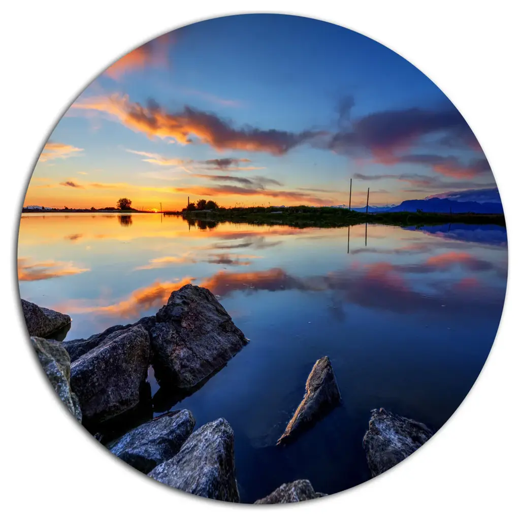 Bring Contemporary Abstraction to your home with this large Circle Metal wall art. This Clouds Reflection in River Metal Artwork makes it the focal point of any room or office. - White Gloss Coating ensures colors are extra vibrant with light reflection.- Aluminum grade Sheet Metal with 1 inch mounting frame on the back giving the illusion that the artwork is floating on the wall..- Mounting Brackets are included along with instructions.- High Quality Digital images are created directly into a glossy aluminum panel producing a stunning and captivating print into the glossy finish of the metal.- Water, Fire and Scratch resistant HD Aluminum panels.- Looks better than any photo paper and guaranteed to last at least 20 years- Easy to clean with a microfiber cloth. Colors are far superior to regular Canvas Art. - Easy to Hang