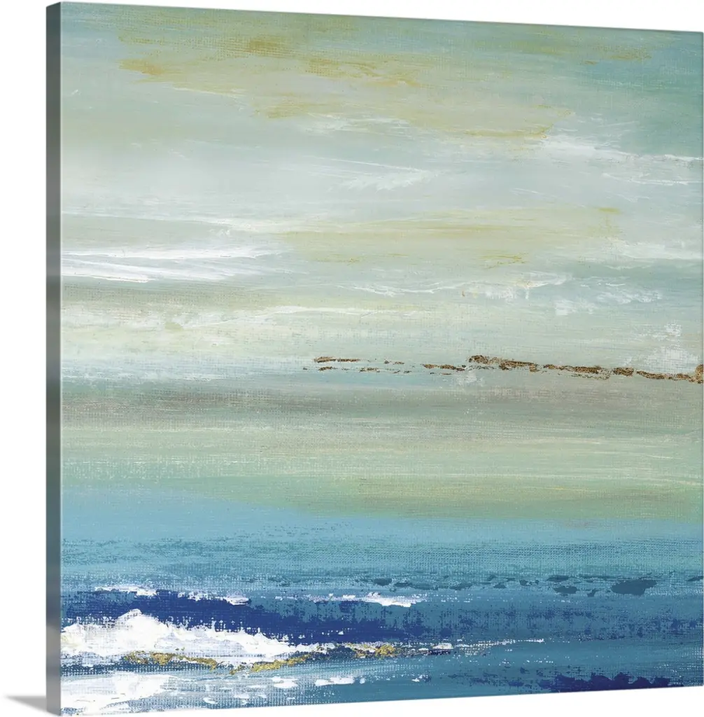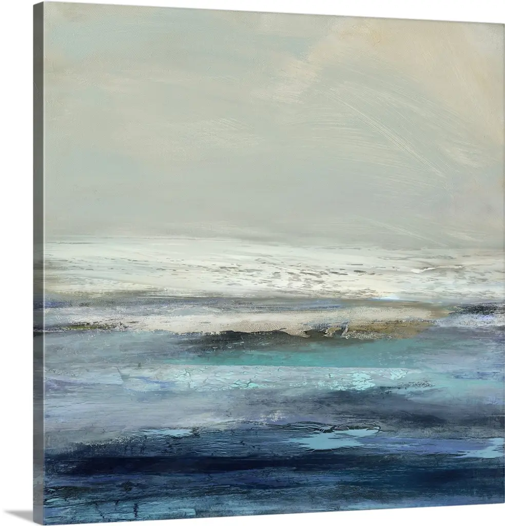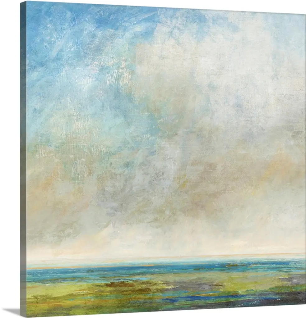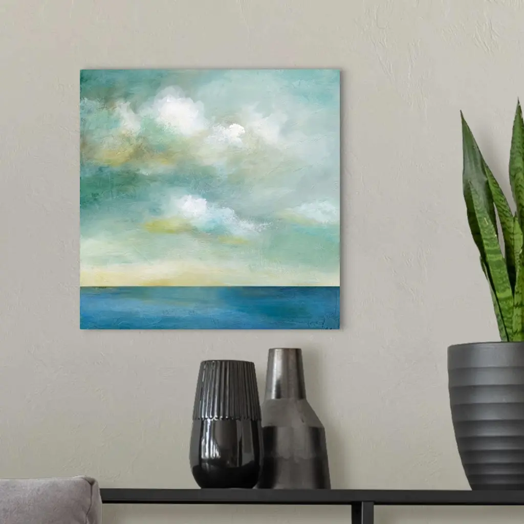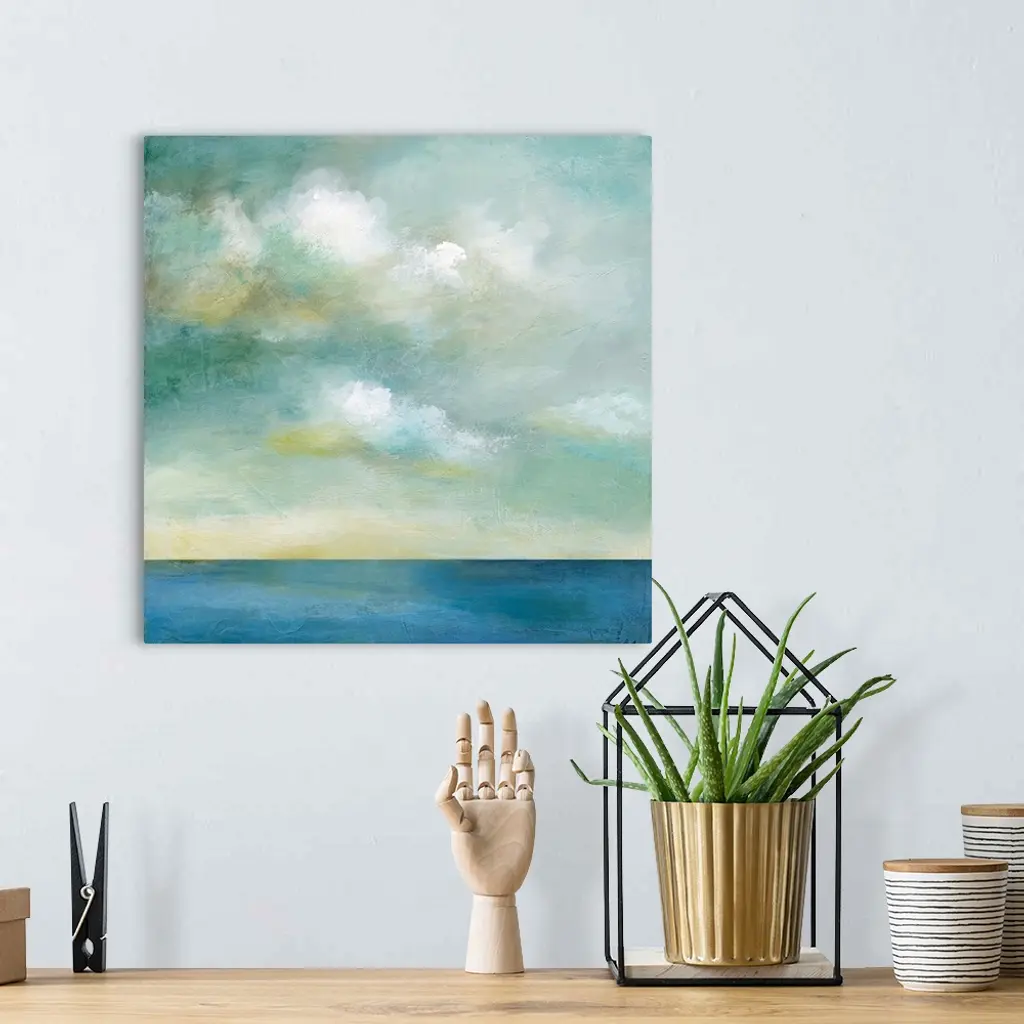 In this contemporary painting, brisk brush strokes compose white fluffy clouds that drift above a still body of water.