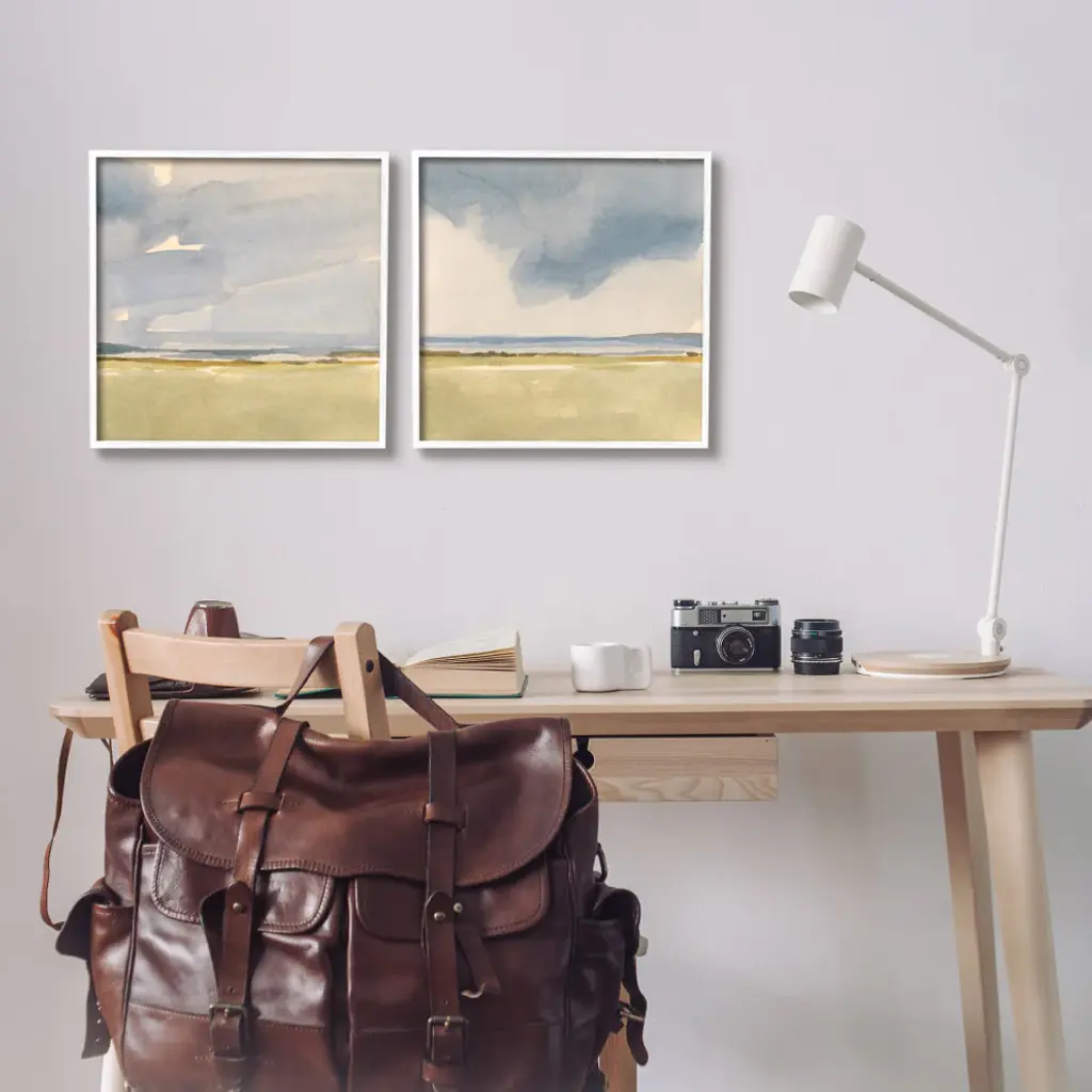 Cloudy Field Nature Landscape Watercolor Collage, 2Pc, Each 17 X 17