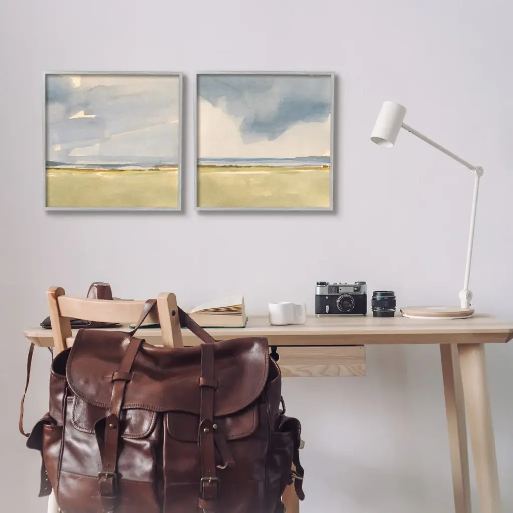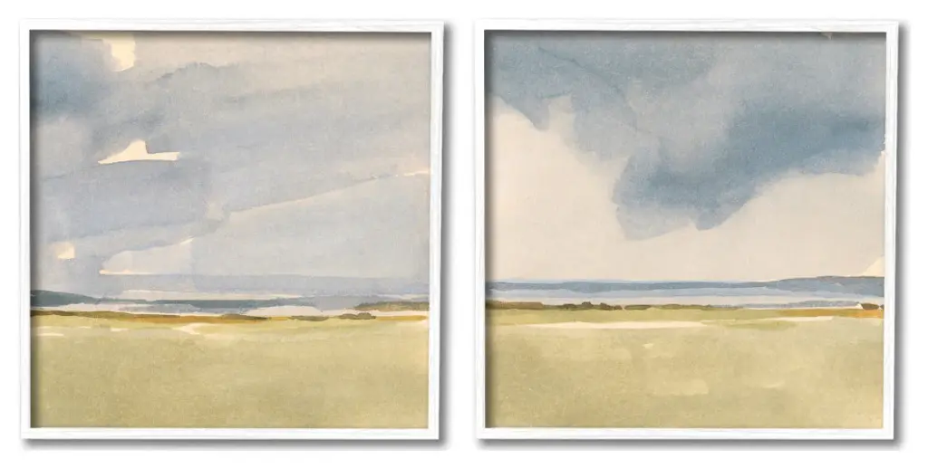 Cloudy Field Nature Landscape Watercolor Collage, 2Pc, Each 17 X 17