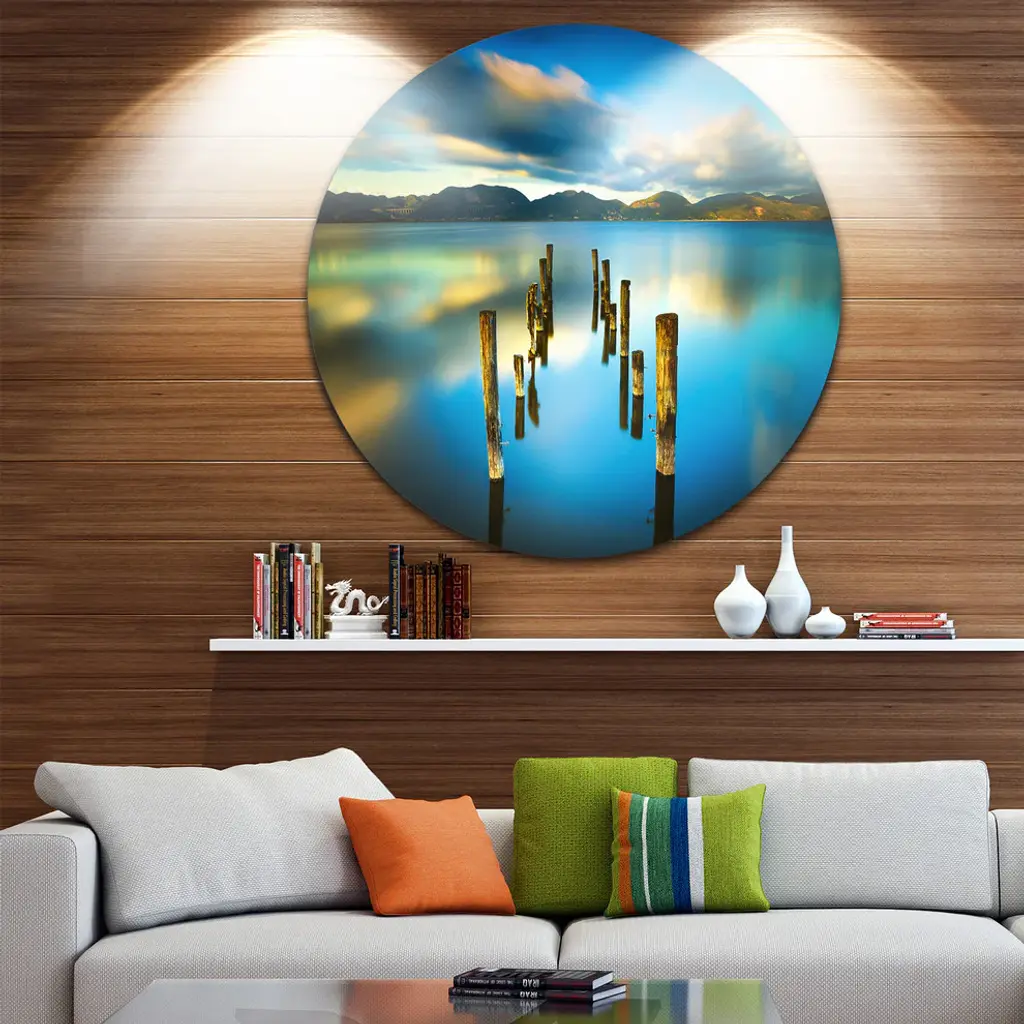 Bring Contemporary Abstraction to your home with this large Circle Metal wall art. This Cloudy Lake with Broken Pier Metal Artwork makes it the focal point of any room or office. - White Gloss Coating ensures colors are extra vibrant with light reflection.- Aluminum grade Sheet Metal with 1 inch mounting frame on the back giving the illusion that the artwork is floating on the wall..- Mounting Brackets are included along with instructions.- High Quality Digital images are created directly into a glossy aluminum panel producing a stunning and captivating print into the glossy finish of the metal.- Water, Fire and Scratch resistant HD Aluminum panels.- Looks better than any photo paper and guaranteed to last at least 20 years- Easy to clean with a microfiber cloth. Colors are far superior to regular Canvas Art. - Easy to Hang