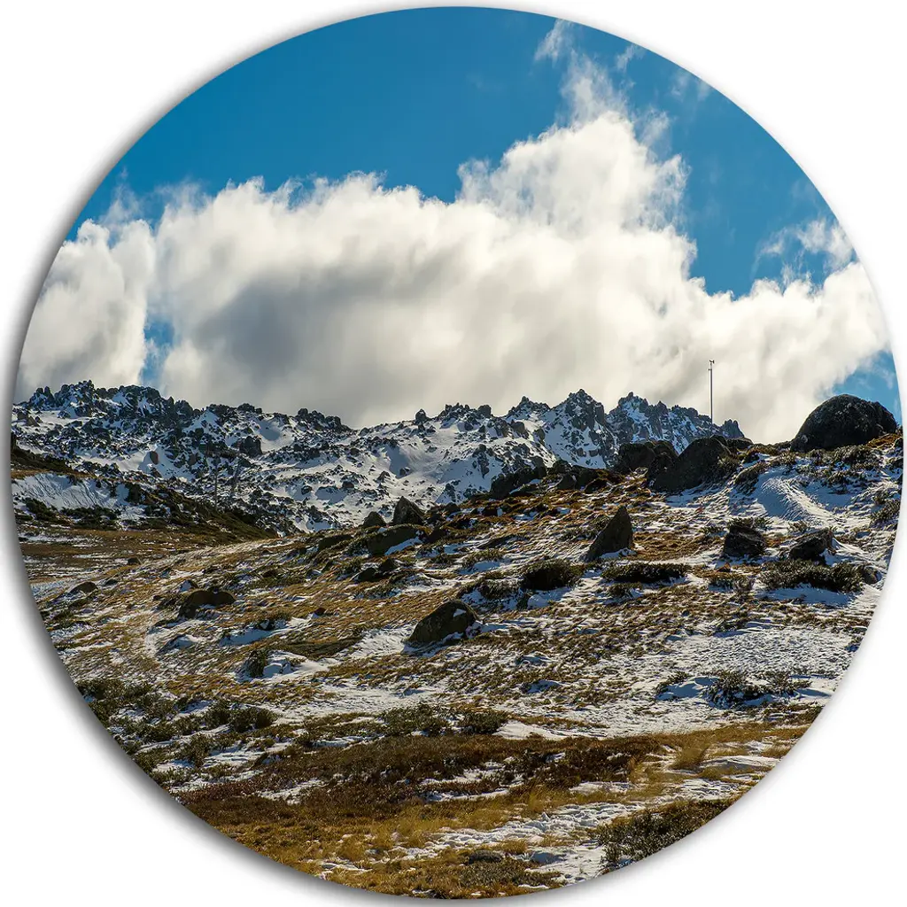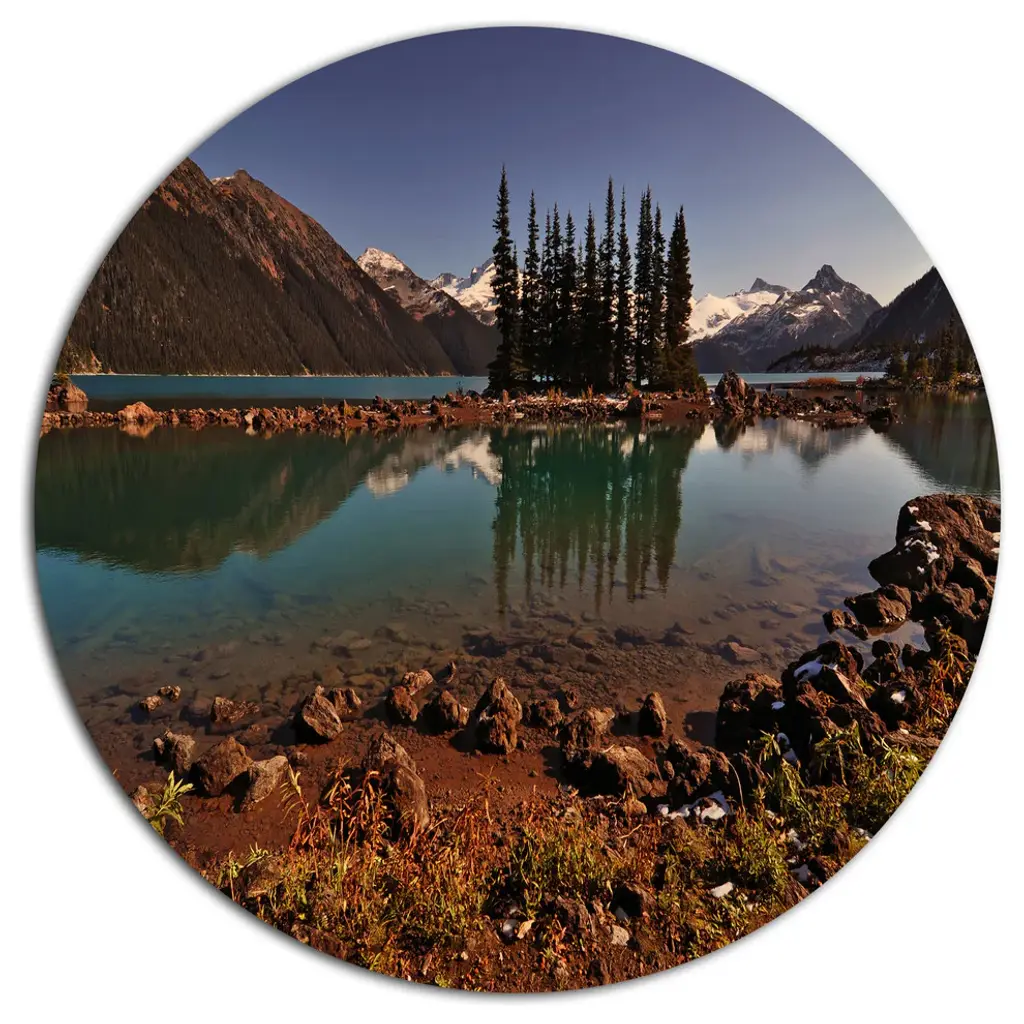 Bring Contemporary Abstraction to your home with this large Circle Metal wall art. This Cloudy Sky above Mountain Lake Metal Artwork makes it the focal point of any room or office. - White Gloss Coating ensures colors are extra vibrant with light reflection.- Aluminum grade Sheet Metal with 1 inch mounting frame on the back giving the illusion that the artwork is floating on the wall..- Mounting Brackets are included along with instructions.- High Quality Digital images are created directly into a glossy aluminum panel producing a stunning and captivating print into the glossy finish of the metal.- Water, Fire and Scratch resistant HD Aluminum panels.- Looks better than any photo paper and guaranteed to last at least 20 years- Easy to clean with a microfiber cloth. Colors are far superior to regular Canvas Art. - Easy to Hang