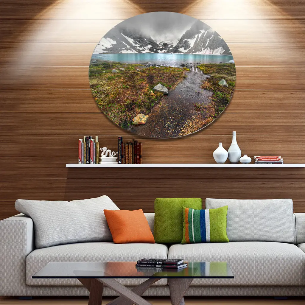 Bring Contemporary Abstraction to your home with this large Circle Metal wall art. This Cloudy Sky above Mountain Lake Metal Artwork makes it the focal point of any room or office. - White Gloss Coating ensures colors are extra vibrant with light reflection.- Aluminum grade Sheet Metal with 1 inch mounting frame on the back giving the illusion that the artwork is floating on the wall..- Mounting Brackets are included along with instructions.- High Quality Digital images are created directly into a glossy aluminum panel producing a stunning and captivating print into the glossy finish of the metal.- Water, Fire and Scratch resistant HD Aluminum panels.- Looks better than any photo paper and guaranteed to last at least 20 years- Easy to clean with a microfiber cloth. Colors are far superior to regular Canvas Art. - Easy to Hang