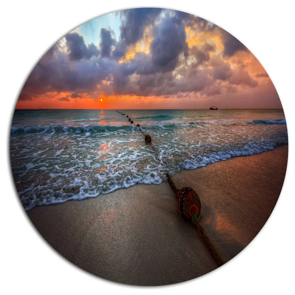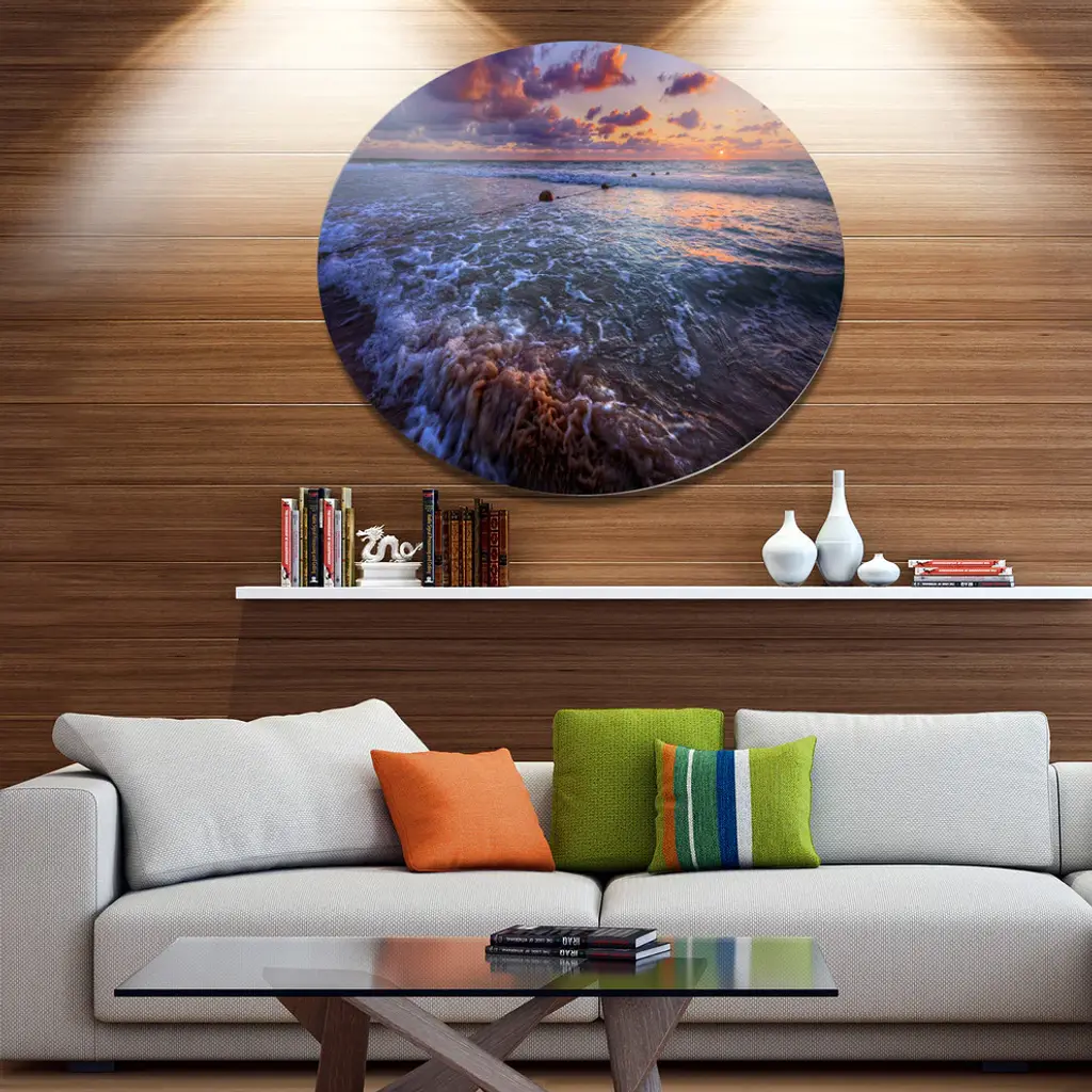 Bring Contemporary Abstraction to your home with this large Circle Metal wall art. This Cloudy Sky and Stormy Waves Metal Artwork makes it the focal point of any room or office. - White Gloss Coating ensures colors are extra vibrant with light reflection.- Aluminum grade Sheet Metal with 1 inch mounting frame on the back giving the illusion that the artwork is floating on the wall..- Mounting Brackets are included along with instructions.- High Quality Digital images are created directly into a glossy aluminum panel producing a stunning and captivating print into the glossy finish of the metal.- Water, Fire and Scratch resistant HD Aluminum panels.- Looks better than any photo paper and guaranteed to last at least 20 years- Easy to clean with a microfiber cloth. Colors are far superior to regular Canvas Art. - Easy to Hang
