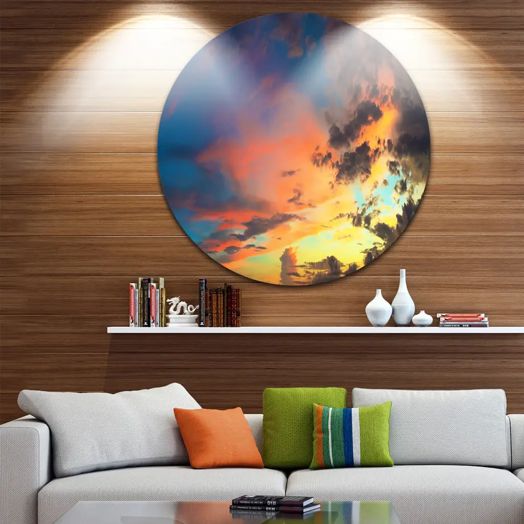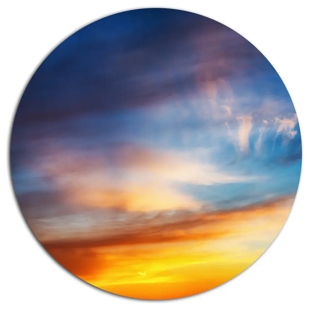 Bring Contemporary Abstraction to your home with this large Circle Metal wall art. This Cloudy Sky at Sunset Panorama Metal Artwork makes it the focal point of any room or office. - White Gloss Coating ensures colors are extra vibrant with light reflection.- Aluminum grade Sheet Metal with 1 inch mounting frame on the back giving the illusion that the artwork is floating on the wall..- Mounting Brackets are included along with instructions.- High Quality Digital images are created directly into a glossy aluminum panel producing a stunning and captivating print into the glossy finish of the metal.- Water, Fire and Scratch resistant HD Aluminum panels.- Looks better than any photo paper and guaranteed to last at least 20 years- Easy to clean with a microfiber cloth. Colors are far superior to regular Canvas Art. - Easy to Hang