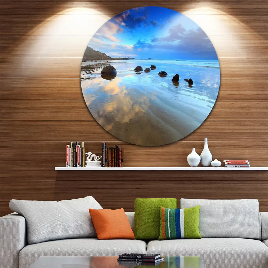 Cloudy Sky Over Moeraki Boulders, Seashore Disc Metal Wall Art, 36"