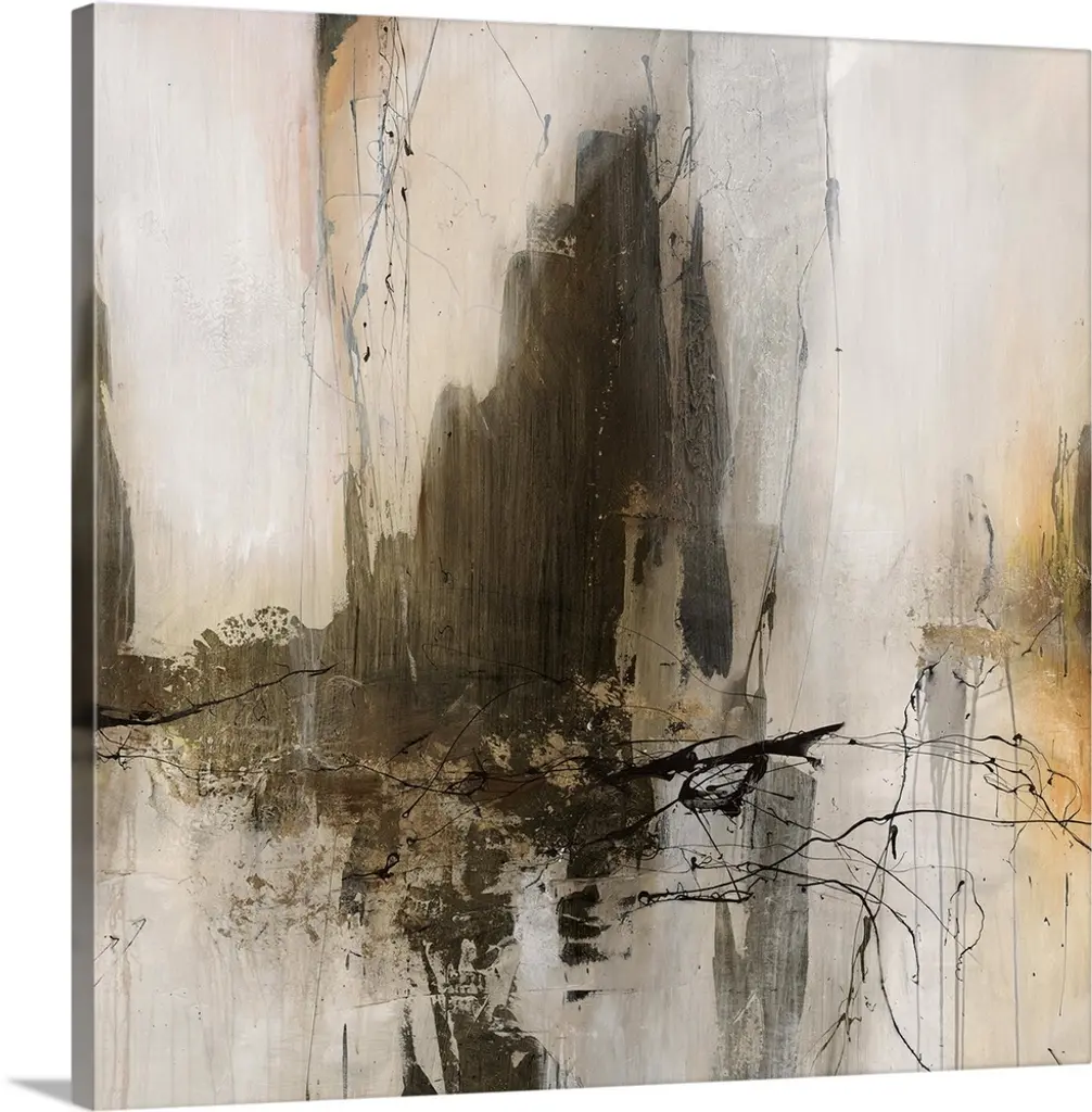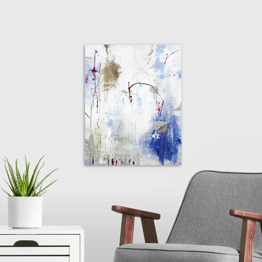 Vertical abstract painting in gold and blue with textured drips of paint.