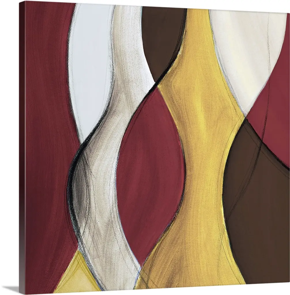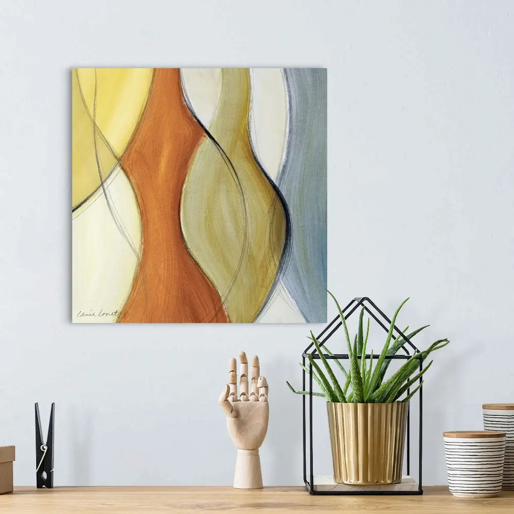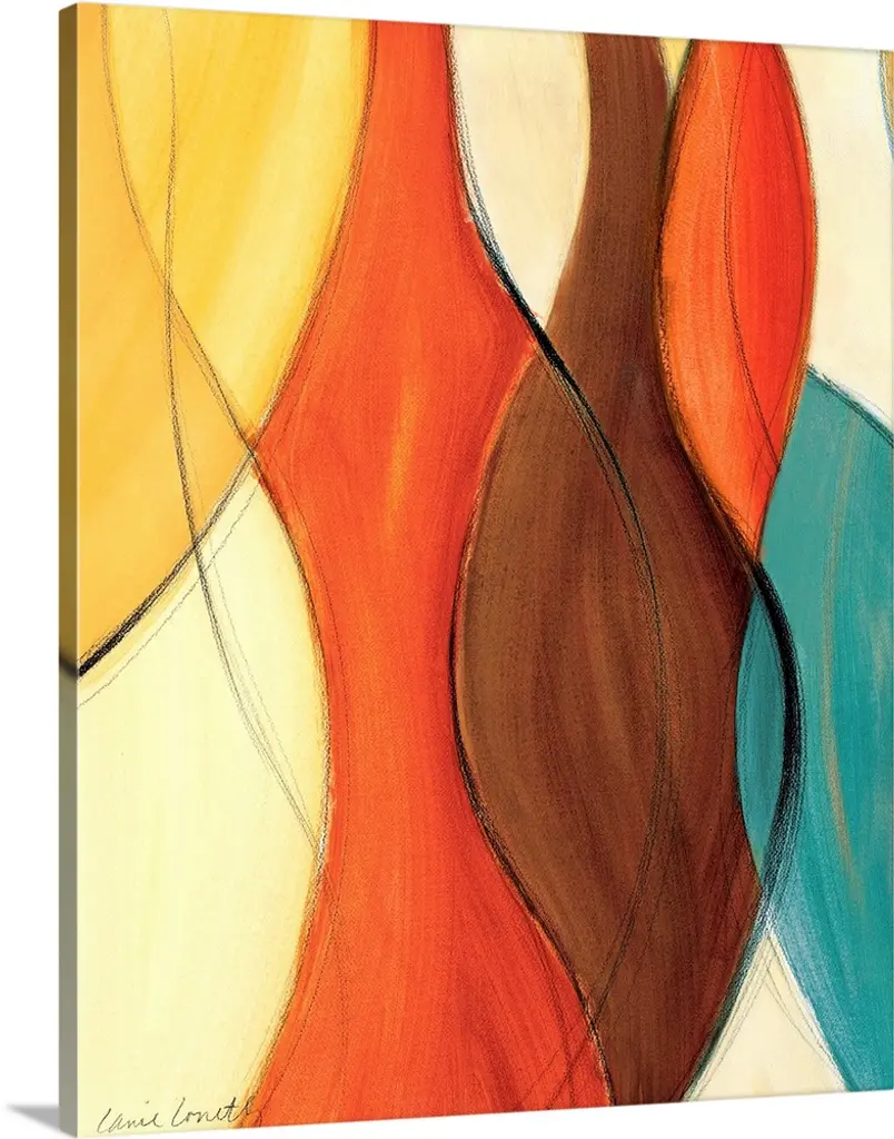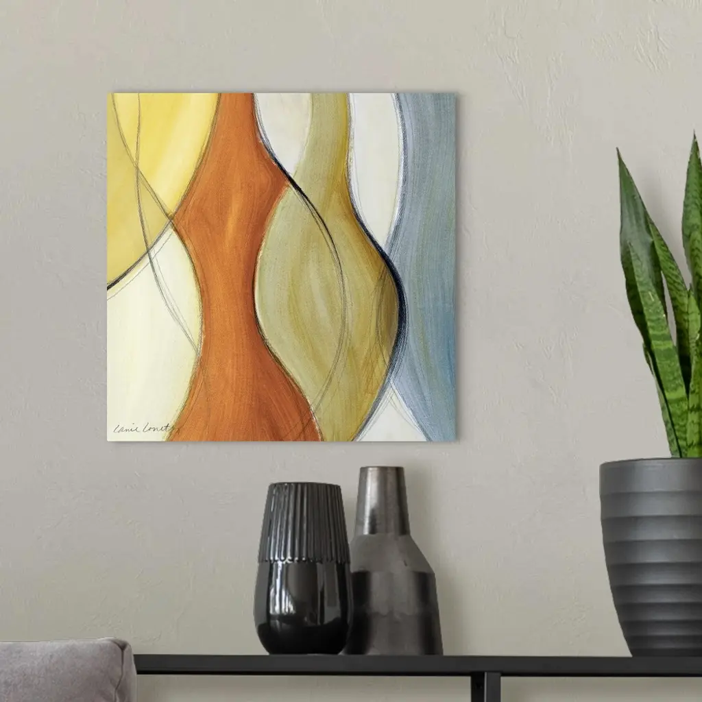 Abstract artwork of different curves of color intertwining throughout the print. The colors are more muted.
